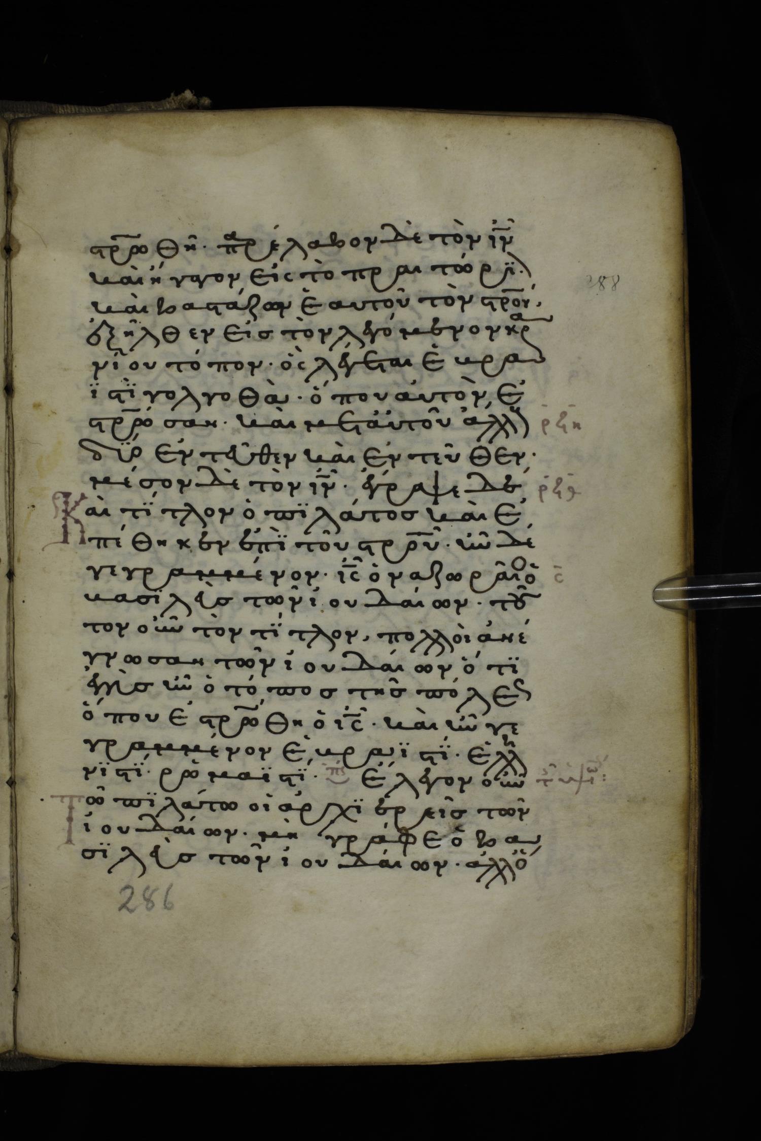 Thirteenth or fourteenth century minuscule of the Gospels on parchment; 312 leaves, 1 column, 19-22 lines per column. Images were taken at the National Library of Greece in Athens.
