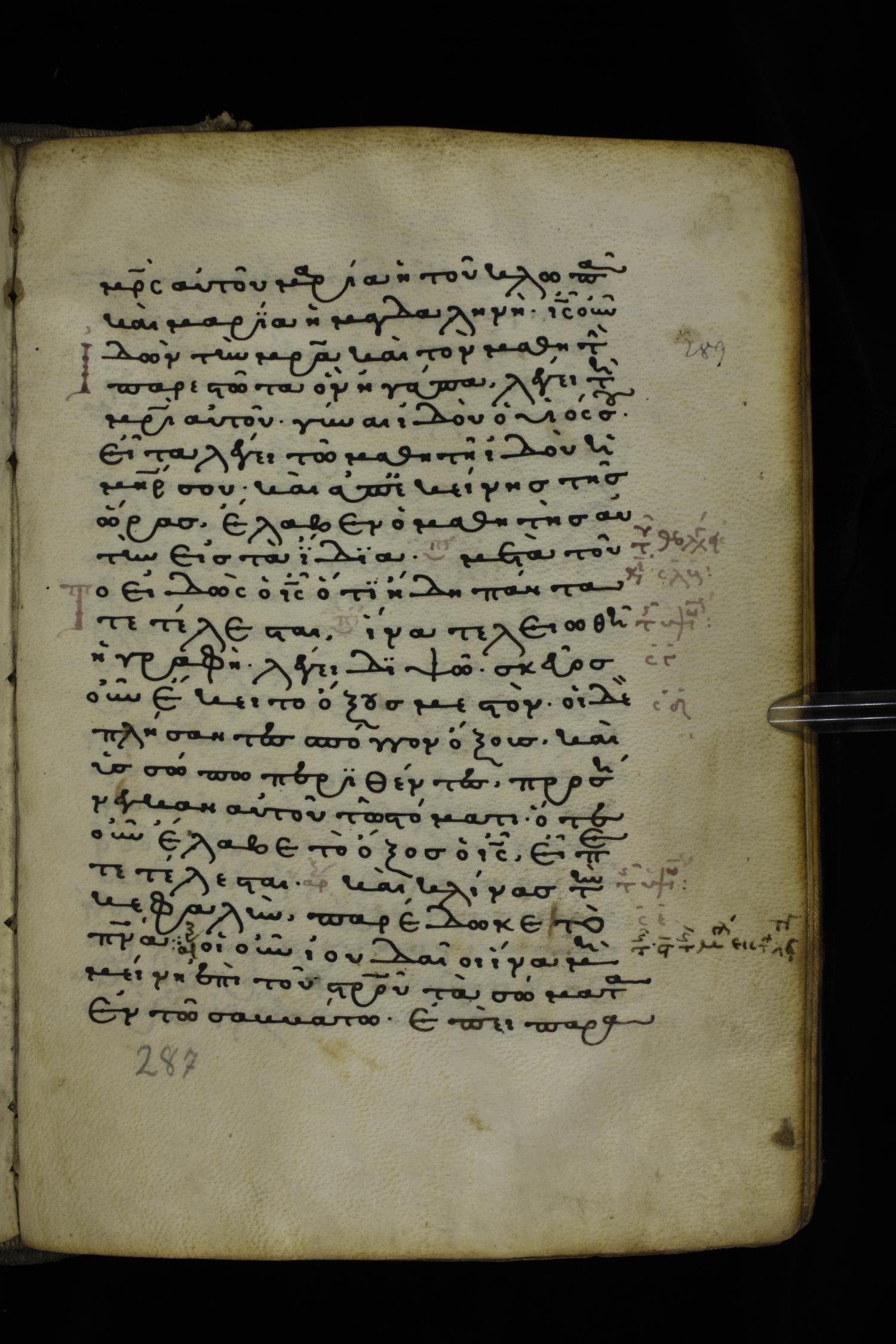 Thirteenth or fourteenth century minuscule of the Gospels on parchment; 312 leaves, 1 column, 19-22 lines per column. Images were taken at the National Library of Greece in Athens.