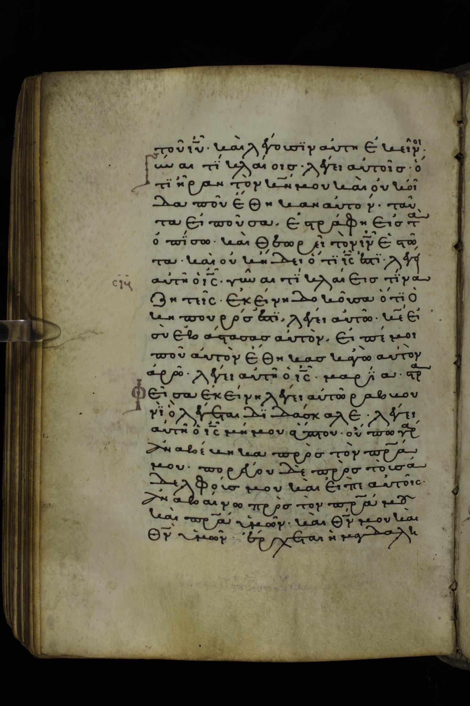 Thirteenth or fourteenth century minuscule of the Gospels on parchment; 312 leaves, 1 column, 19-22 lines per column. Images were taken at the National Library of Greece in Athens.