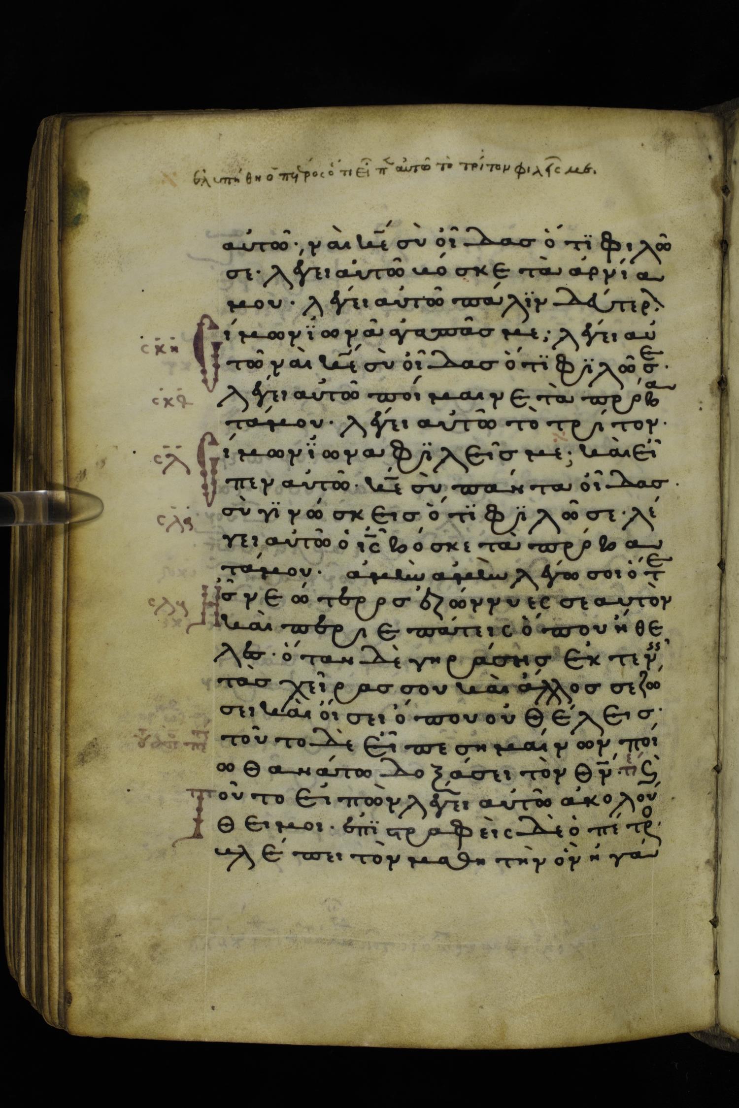 λέγει αὐτῷ τὸ τρίτον Σίμων Ἰωάνου / Ἰωάννου, φιλεῖς με; ἐλυπήθη ὁ Πέτρος ὅτι εἶπεν αὐτῷ τὸ τρίτον Φιλεῖς με; καὶ εἶπεν / λέγει αὐτῷ Κύριε, πάντα σὺ οἶδας, σὺ γινώσκεις ὅτι φιλῶ σε. λέγει αὐτῷ {ὁ} Ἰησοῦς Βόσκε τὰ προβάτιά / πρόβατά μου.