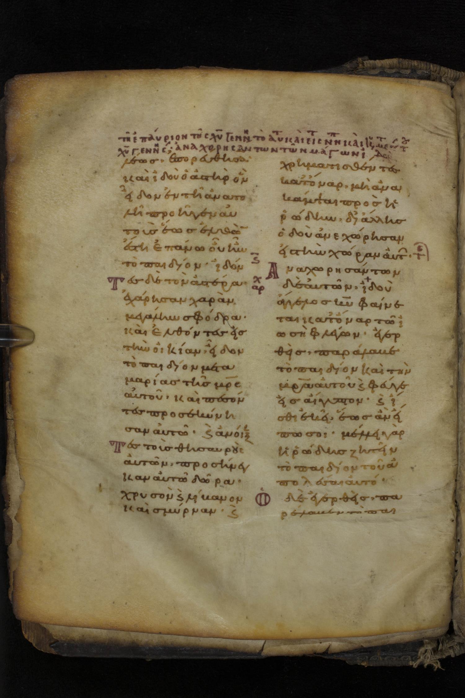 Eleventh century minuscule of the Gospels on parchment; 266 leaves, 2 column, 22 lines per column. Images were taken at the National Library of Greece in Athens.