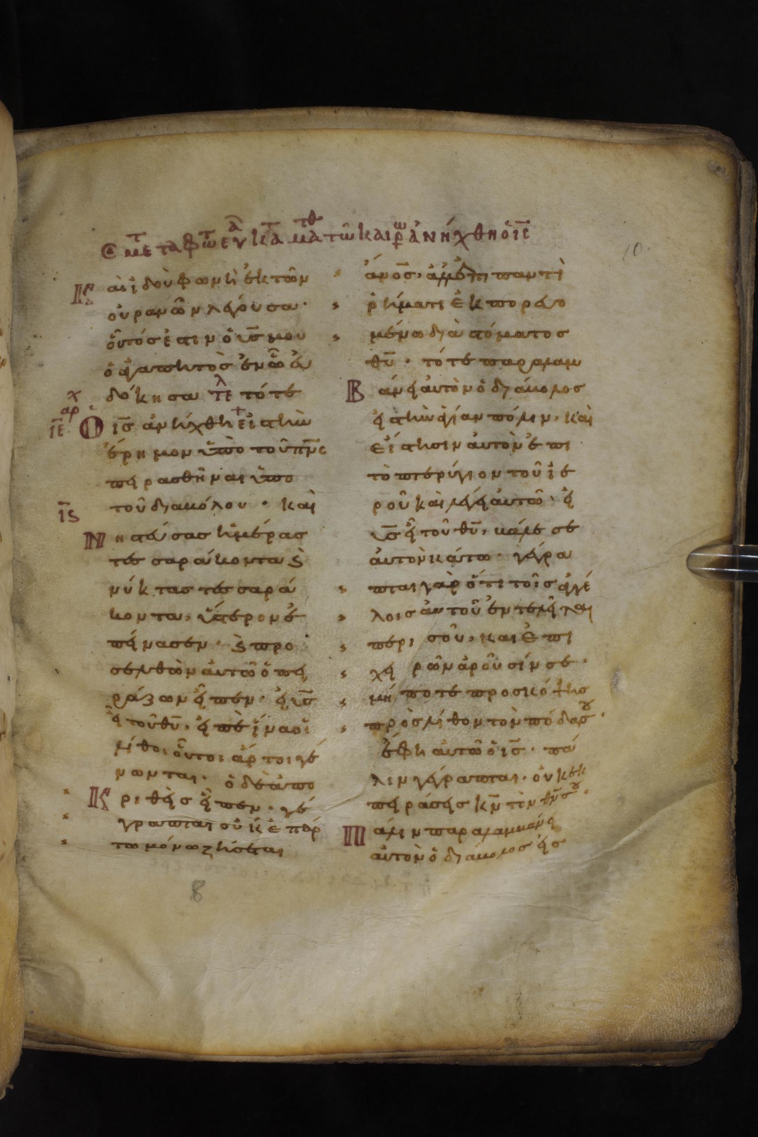 Eleventh century minuscule of the Gospels on parchment; 266 leaves, 2 column, 22 lines per column. Images were taken at the National Library of Greece in Athens.