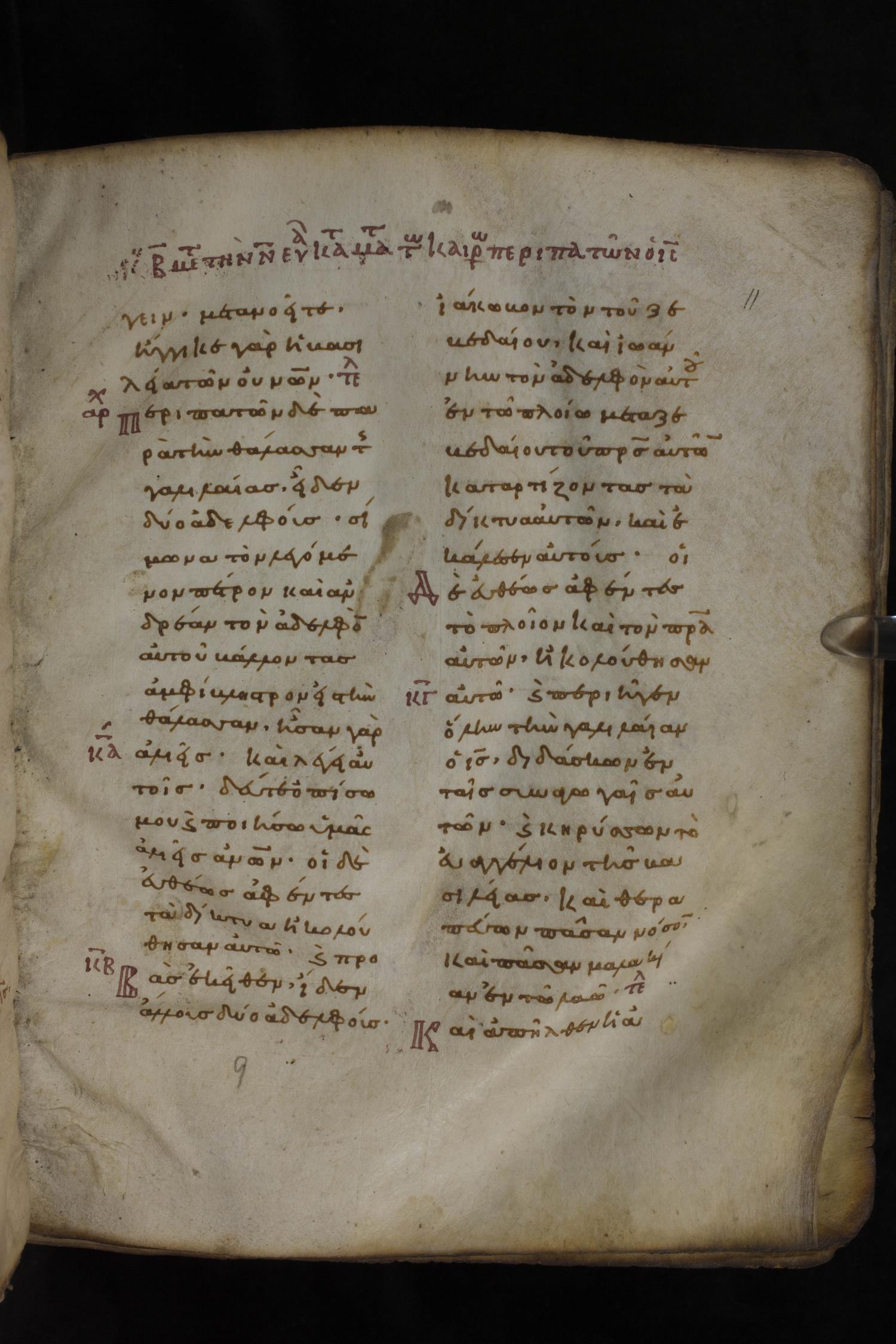 Eleventh century minuscule of the Gospels on parchment; 266 leaves, 2 column, 22 lines per column. Images were taken at the National Library of Greece in Athens.
