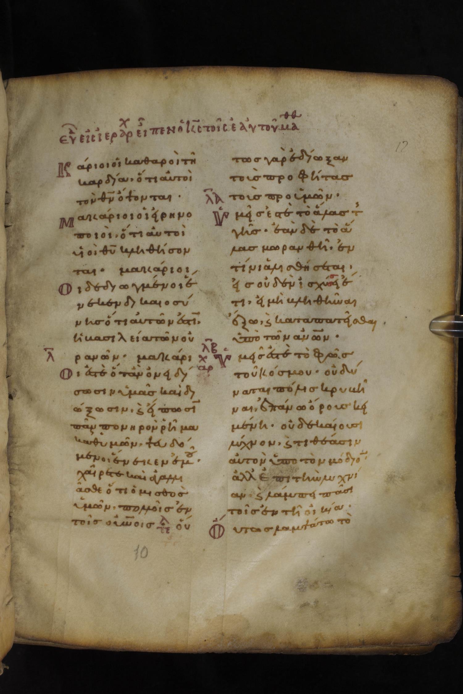 Eleventh century minuscule of the Gospels on parchment; 266 leaves, 2 column, 22 lines per column. Images were taken at the National Library of Greece in Athens.
