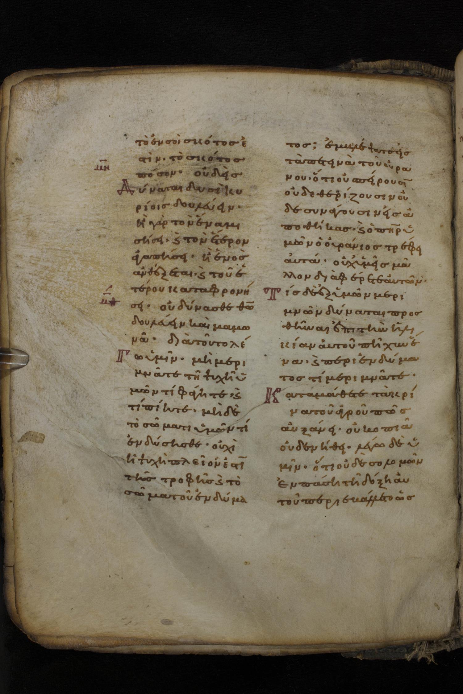 Eleventh century minuscule of the Gospels on parchment; 266 leaves, 2 column, 22 lines per column. Images were taken at the National Library of Greece in Athens.