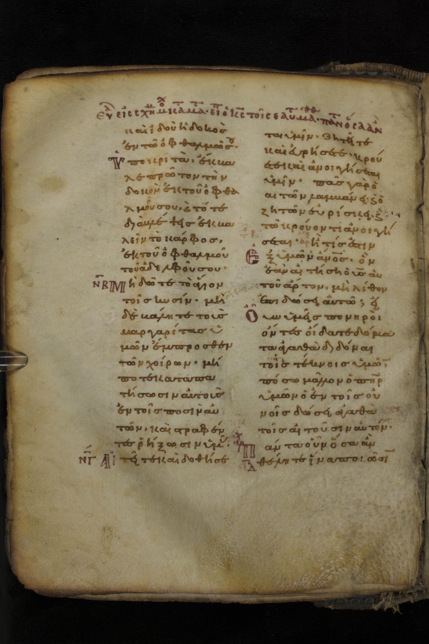 Eleventh century minuscule of the Gospels on parchment; 266 leaves, 2 column, 22 lines per column. Images were taken at the National Library of Greece in Athens.