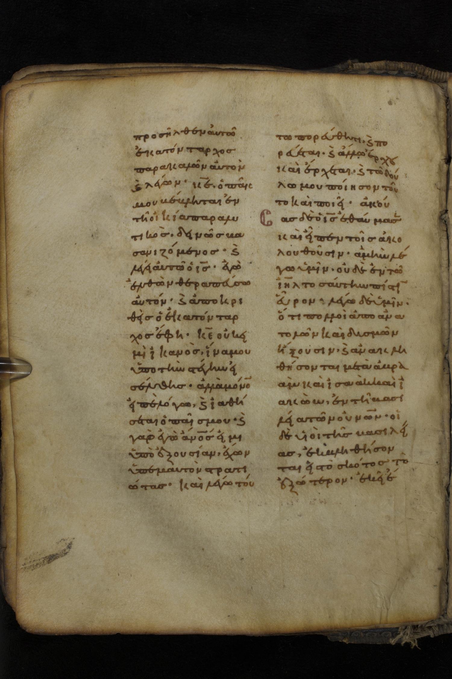 Eleventh century minuscule of the Gospels on parchment; 266 leaves, 2 column, 22 lines per column. Images were taken at the National Library of Greece in Athens.