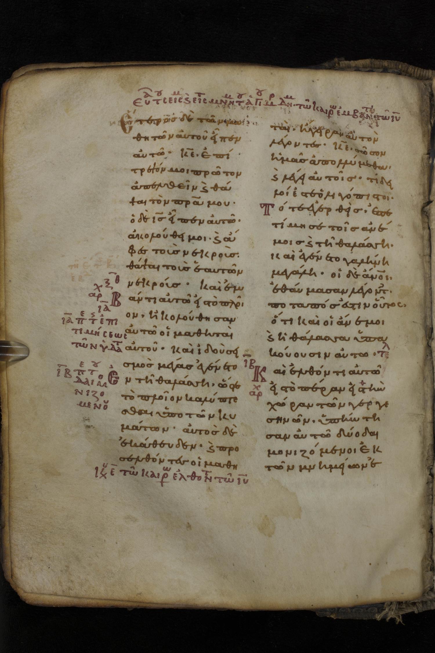 Eleventh century minuscule of the Gospels on parchment; 266 leaves, 2 column, 22 lines per column. Images were taken at the National Library of Greece in Athens.