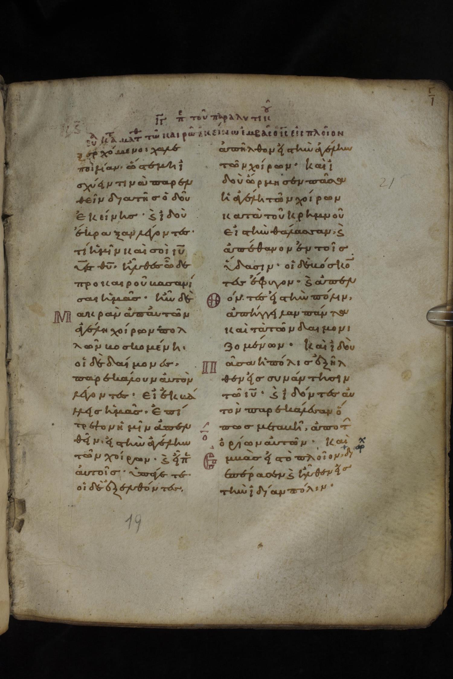 Eleventh century minuscule of the Gospels on parchment; 266 leaves, 2 column, 22 lines per column. Images were taken at the National Library of Greece in Athens.