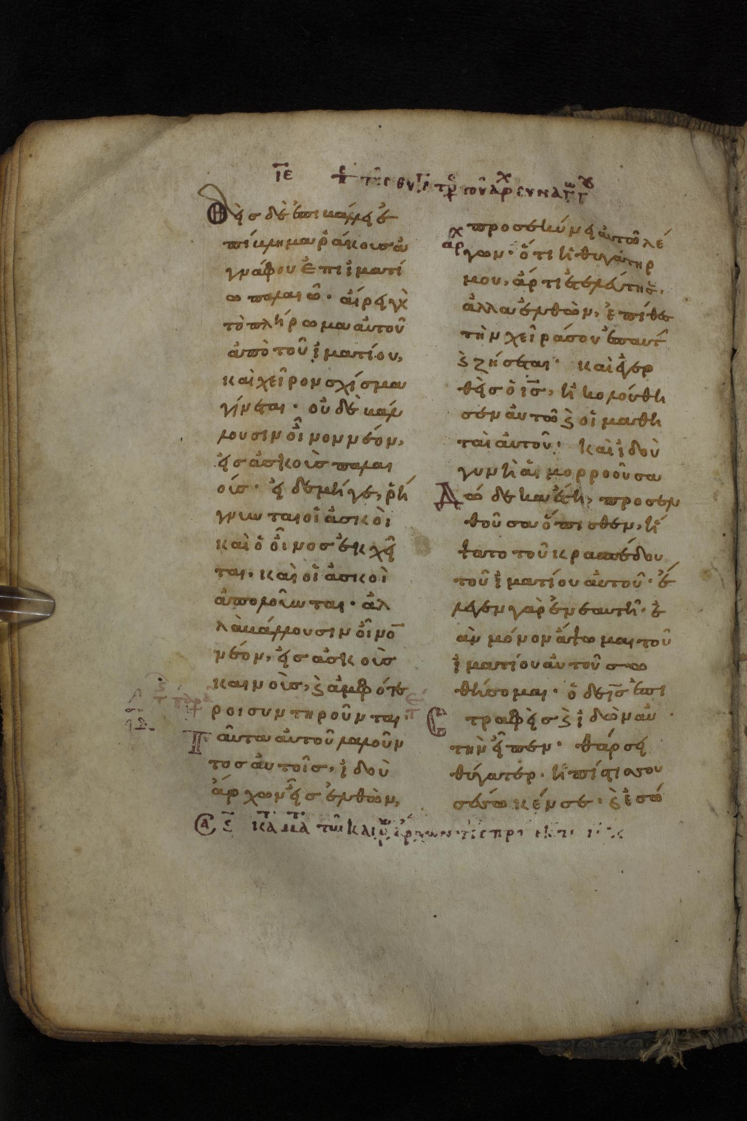 Eleventh century minuscule of the Gospels on parchment; 266 leaves, 2 column, 22 lines per column. Images were taken at the National Library of Greece in Athens.