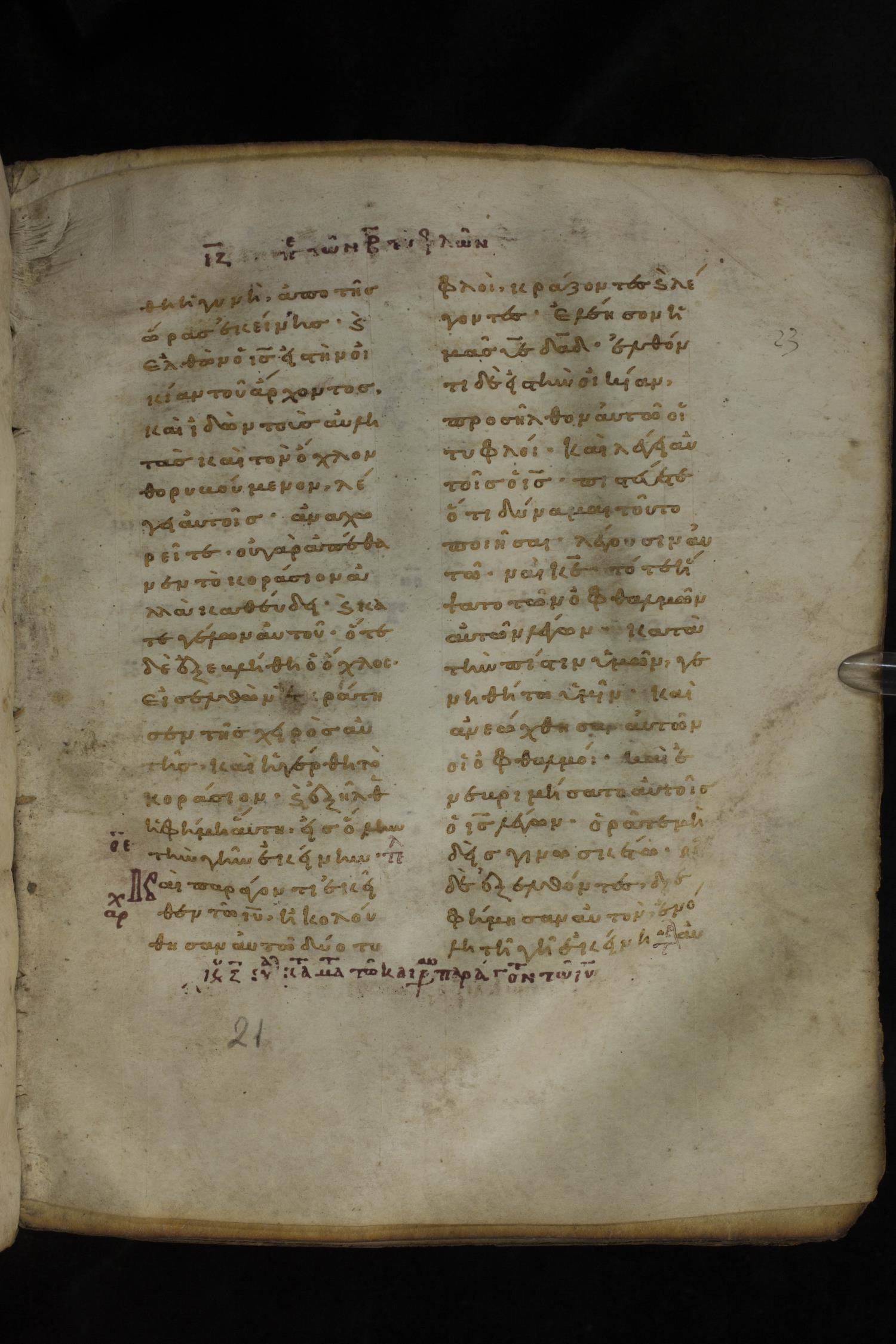 Eleventh century minuscule of the Gospels on parchment; 266 leaves, 2 column, 22 lines per column. Images were taken at the National Library of Greece in Athens.