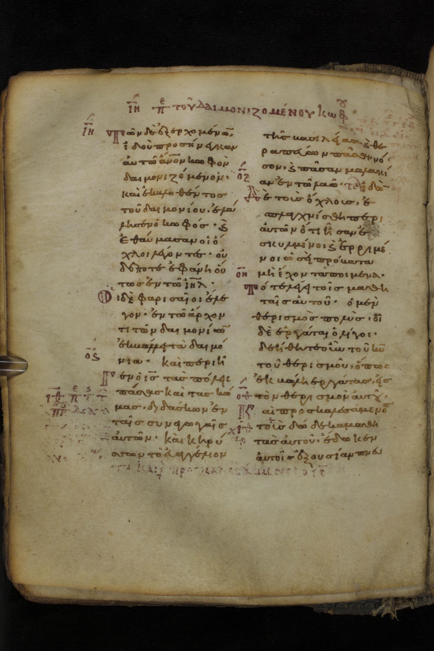 Eleventh century minuscule of the Gospels on parchment; 266 leaves, 2 column, 22 lines per column. Images were taken at the National Library of Greece in Athens.