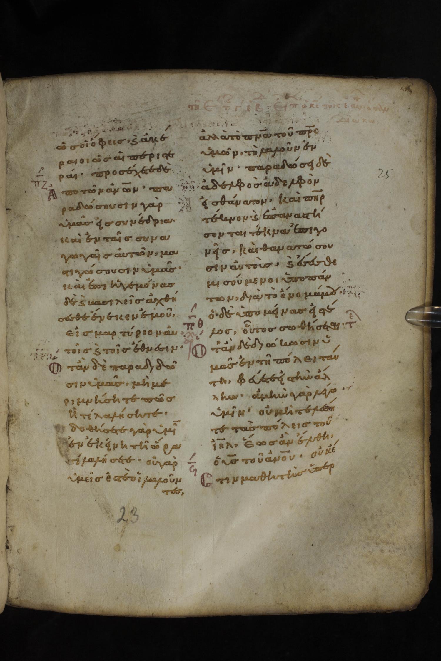 Eleventh century minuscule of the Gospels on parchment; 266 leaves, 2 column, 22 lines per column. Images were taken at the National Library of Greece in Athens.