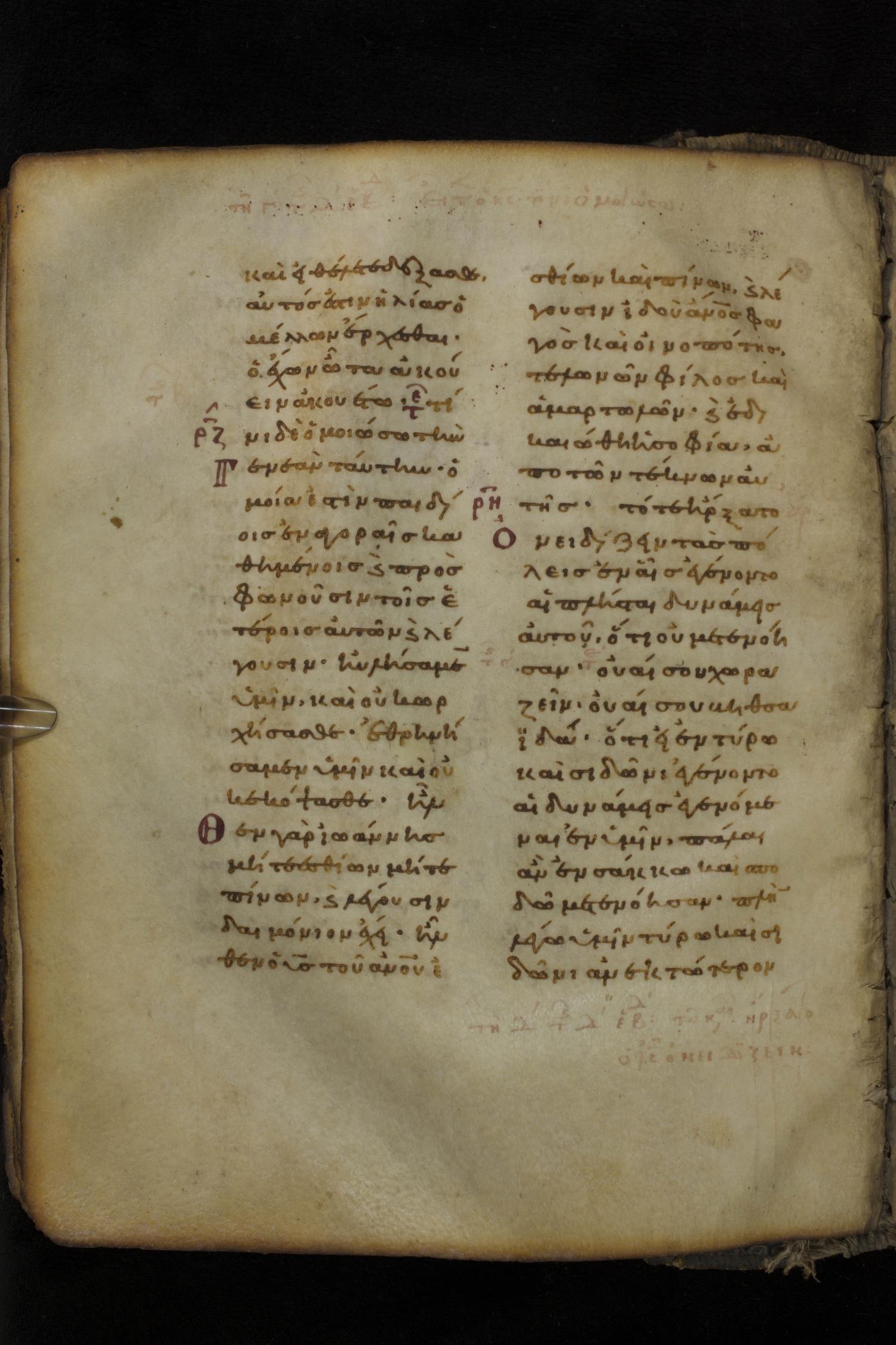 Eleventh century minuscule of the Gospels on parchment; 266 leaves, 2 column, 22 lines per column. Images were taken at the National Library of Greece in Athens.