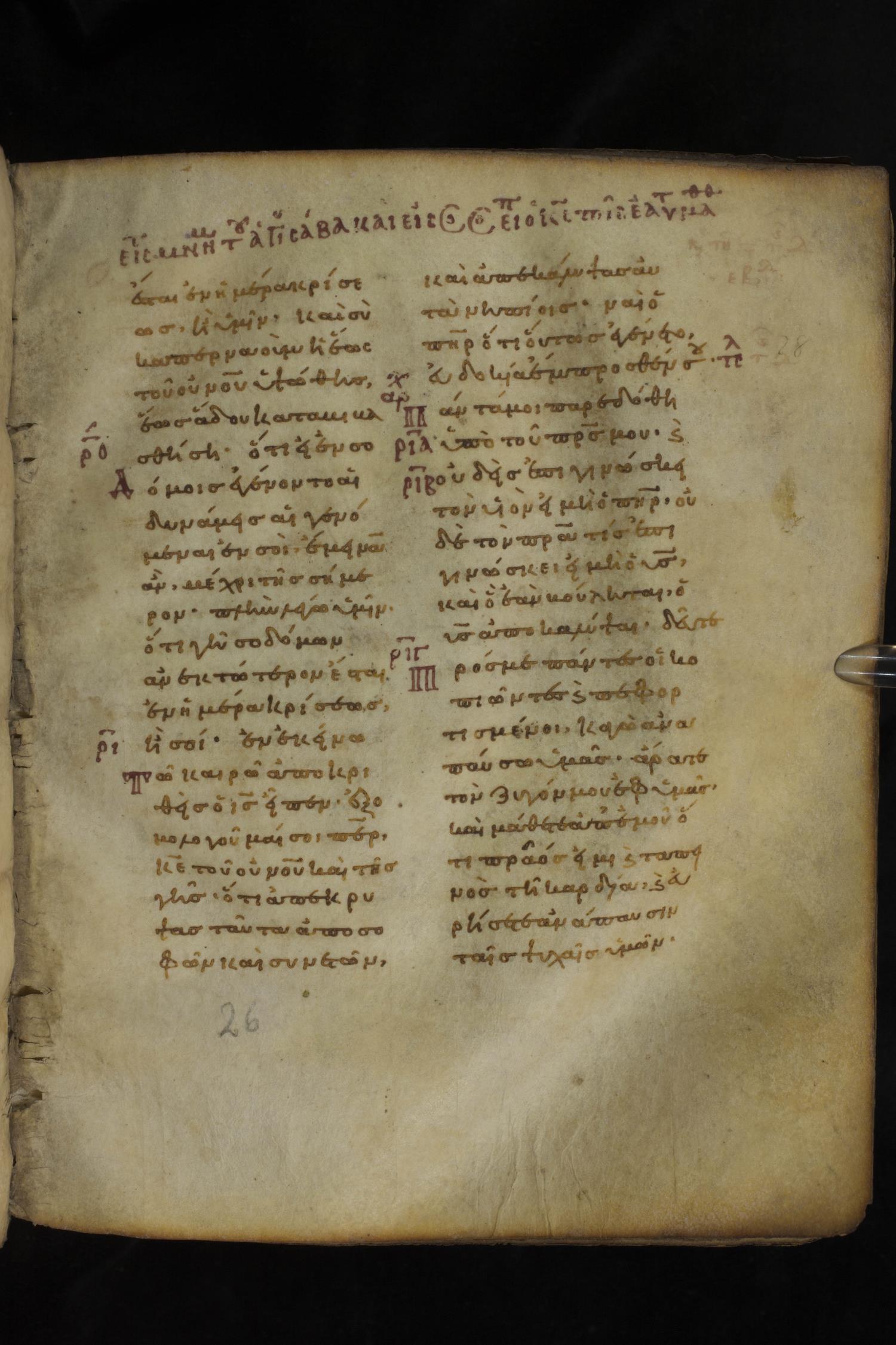 Eleventh century minuscule of the Gospels on parchment; 266 leaves, 2 column, 22 lines per column. Images were taken at the National Library of Greece in Athens.