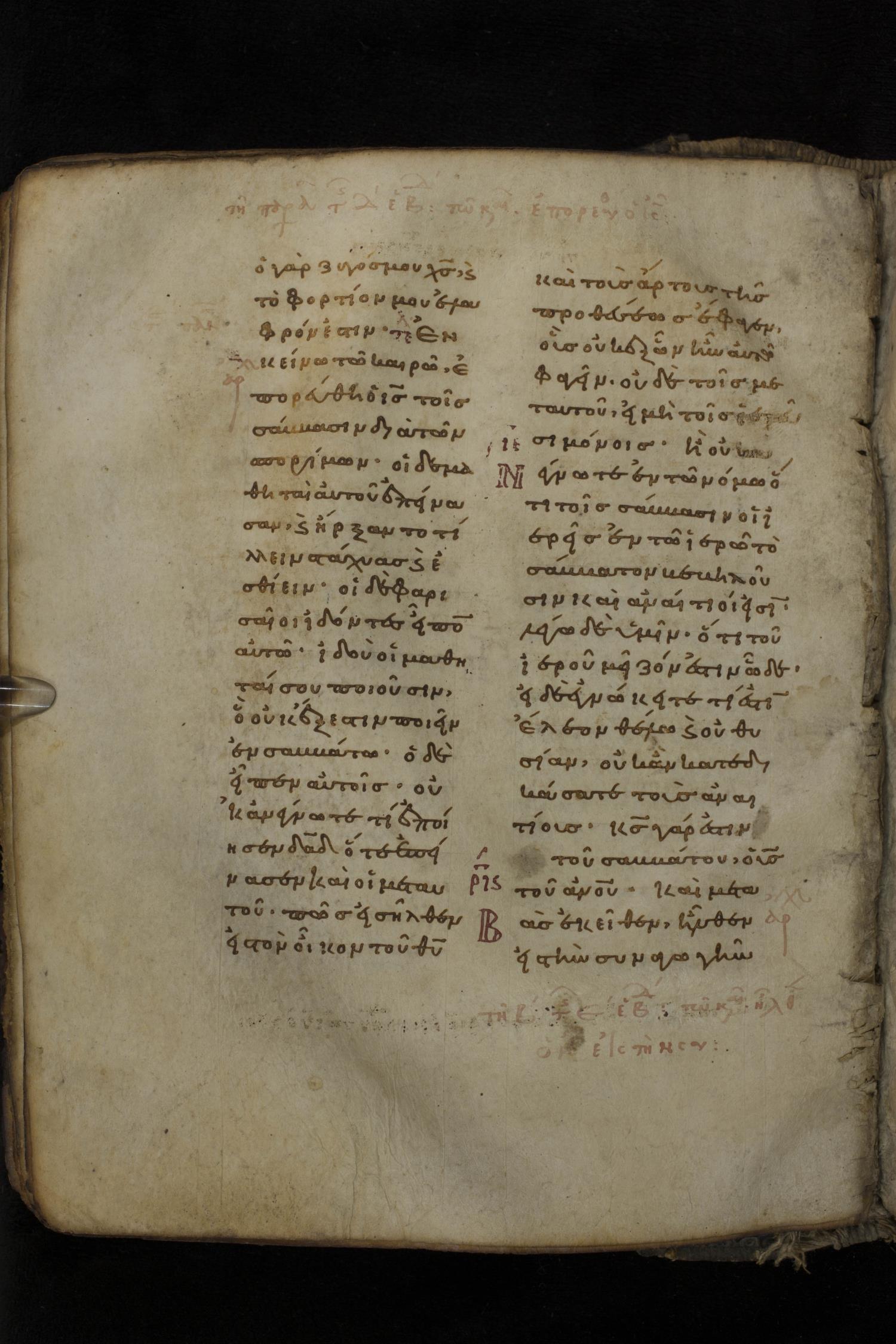 Eleventh century minuscule of the Gospels on parchment; 266 leaves, 2 column, 22 lines per column. Images were taken at the National Library of Greece in Athens.