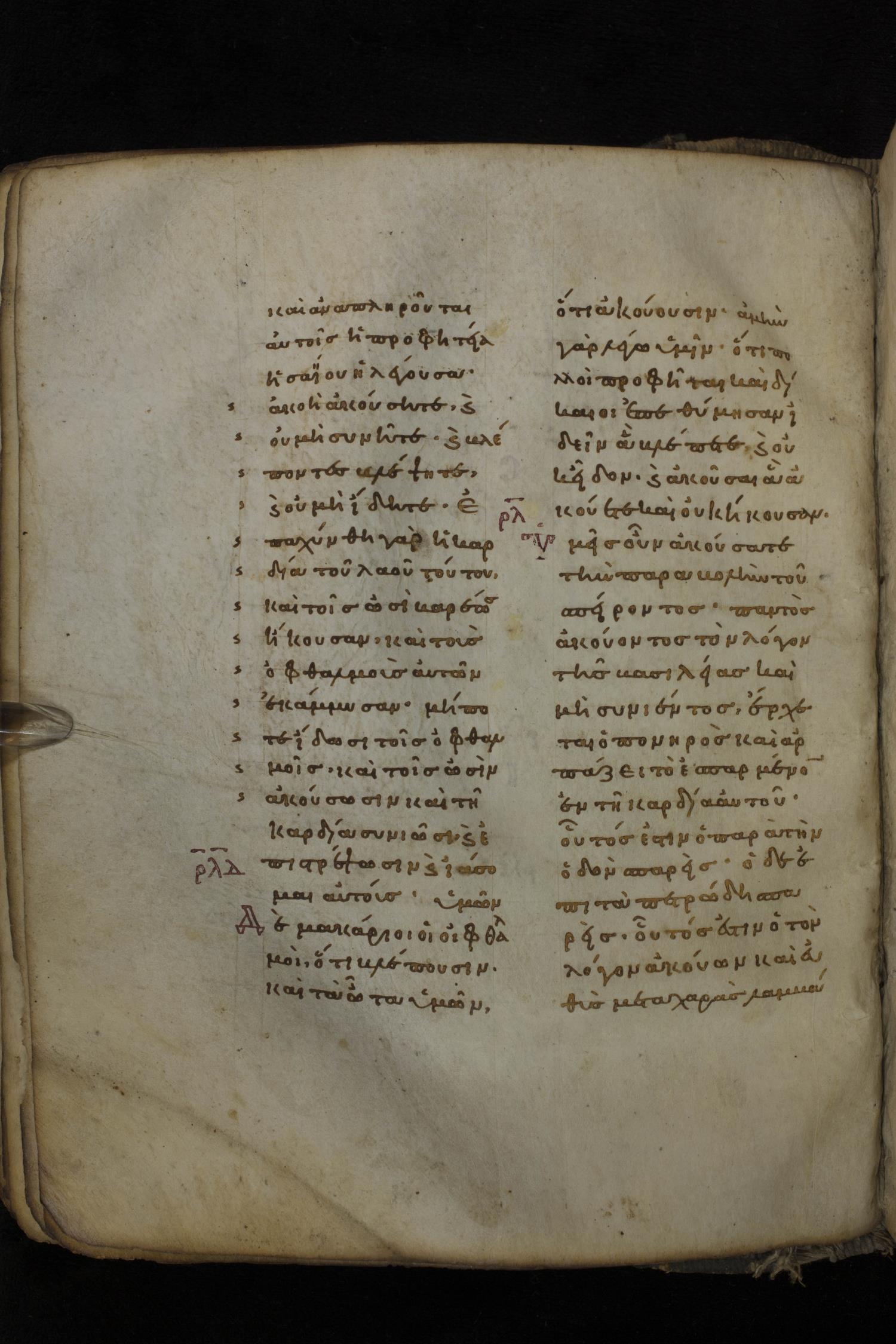Eleventh century minuscule of the Gospels on parchment; 266 leaves, 2 column, 22 lines per column. Images were taken at the National Library of Greece in Athens.