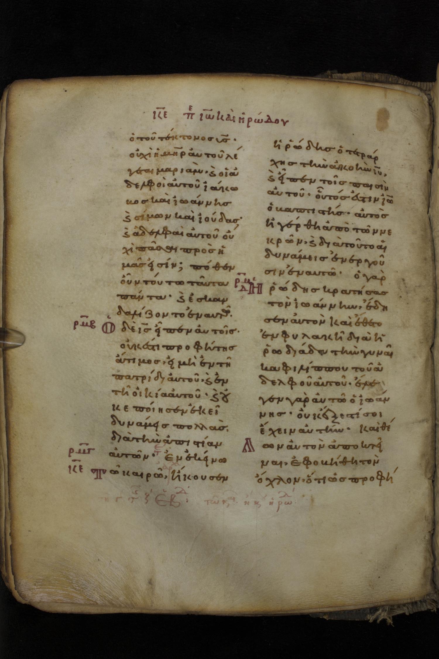 Eleventh century minuscule of the Gospels on parchment; 266 leaves, 2 column, 22 lines per column. Images were taken at the National Library of Greece in Athens.