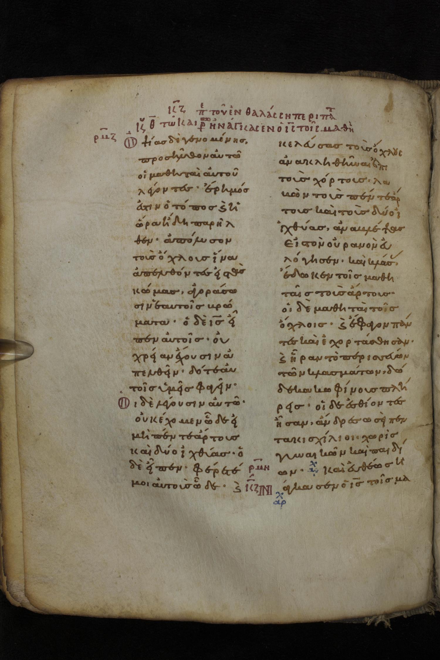 Eleventh century minuscule of the Gospels on parchment; 266 leaves, 2 column, 22 lines per column. Images were taken at the National Library of Greece in Athens.