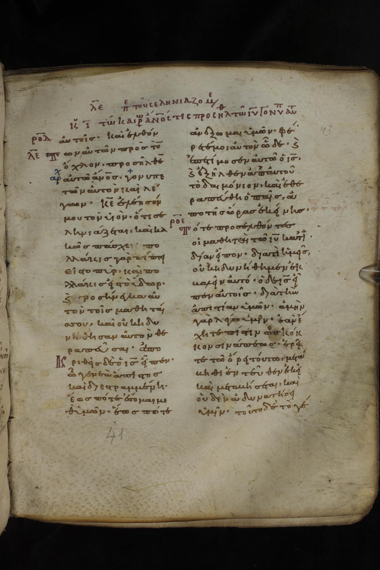 Eleventh century minuscule of the Gospels on parchment; 266 leaves, 2 column, 22 lines per column. Images were taken at the National Library of Greece in Athens.