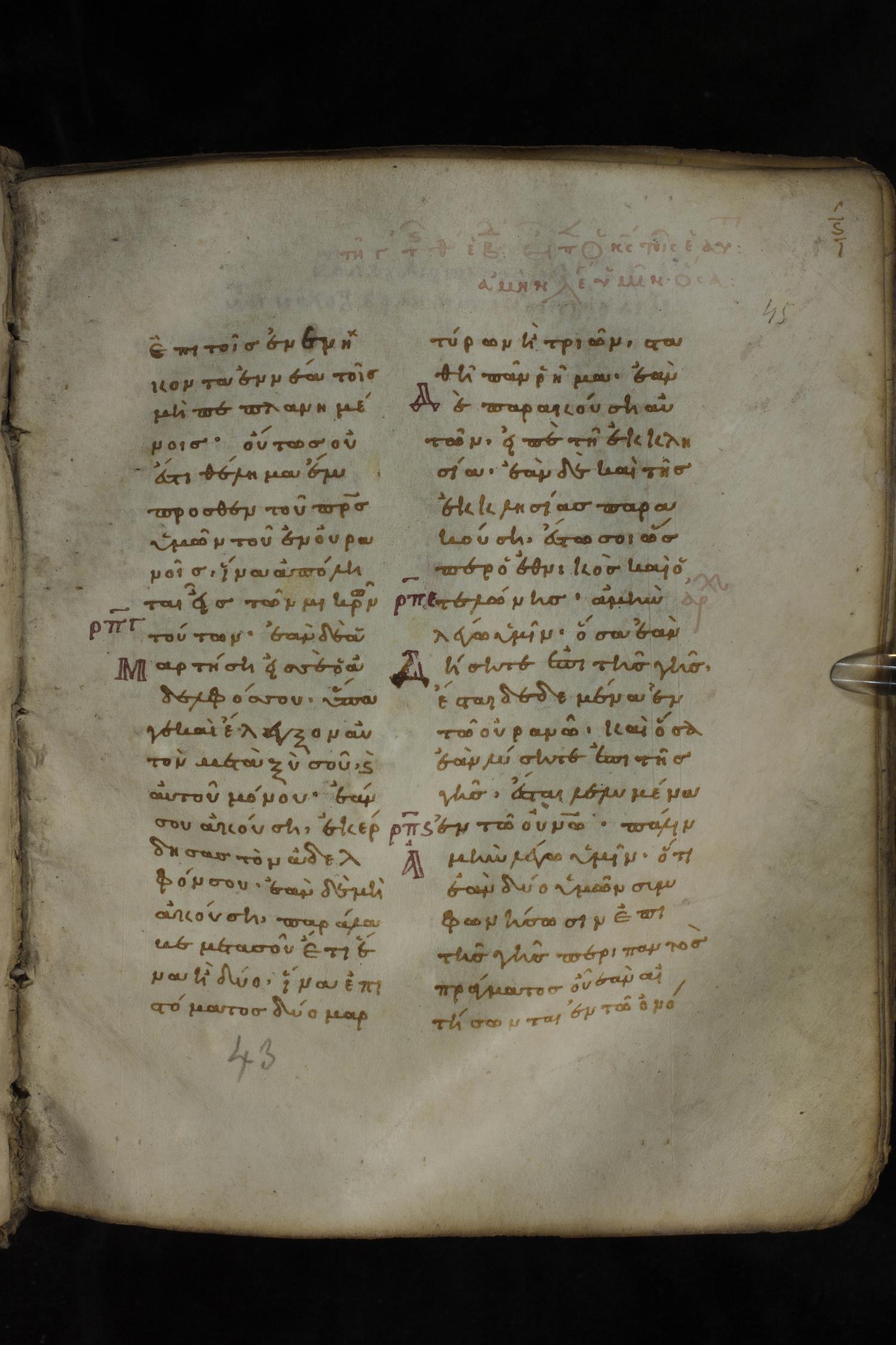 Eleventh century minuscule of the Gospels on parchment; 266 leaves, 2 column, 22 lines per column. Images were taken at the National Library of Greece in Athens.