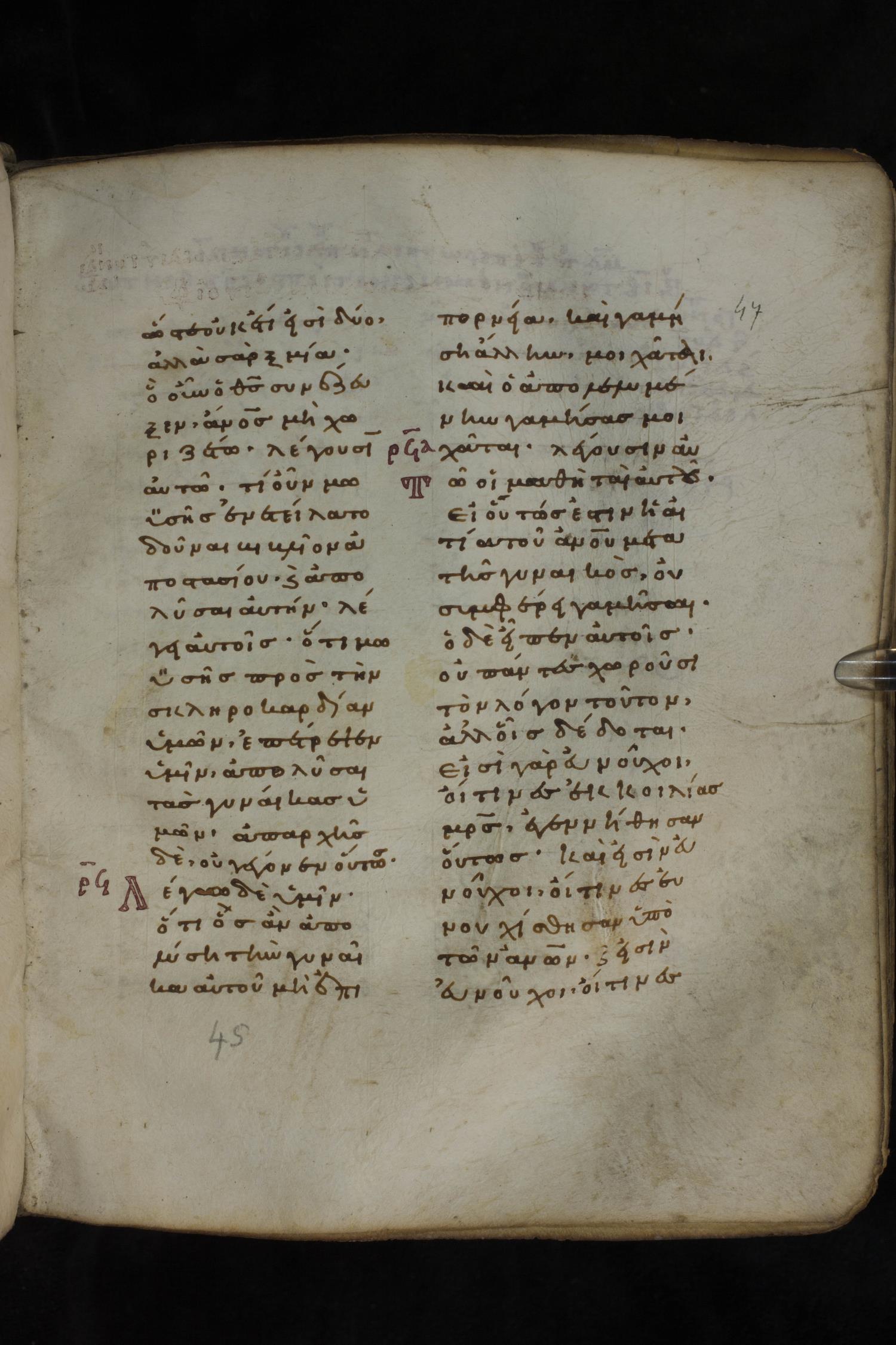 Eleventh century minuscule of the Gospels on parchment; 266 leaves, 2 column, 22 lines per column. Images were taken at the National Library of Greece in Athens.