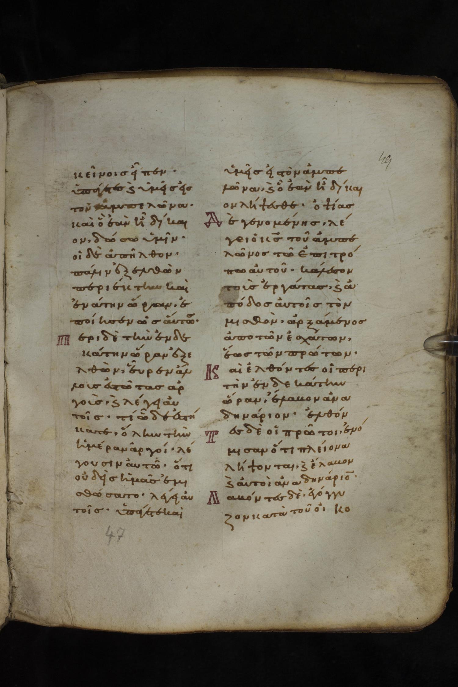 Eleventh century minuscule of the Gospels on parchment; 266 leaves, 2 column, 22 lines per column. Images were taken at the National Library of Greece in Athens.