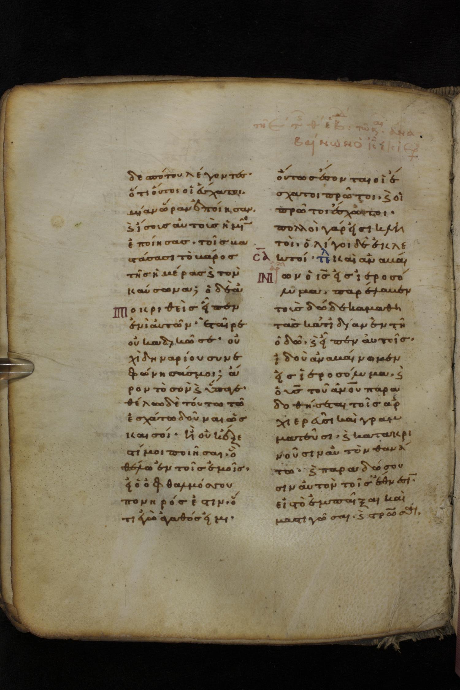 Eleventh century minuscule of the Gospels on parchment; 266 leaves, 2 column, 22 lines per column. Images were taken at the National Library of Greece in Athens.