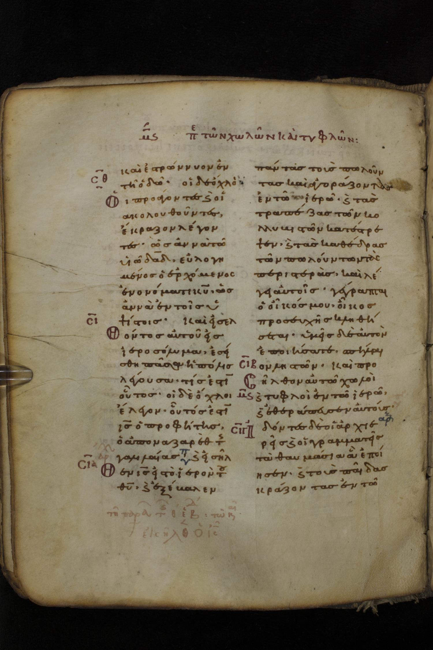 Eleventh century minuscule of the Gospels on parchment; 266 leaves, 2 column, 22 lines per column. Images were taken at the National Library of Greece in Athens.