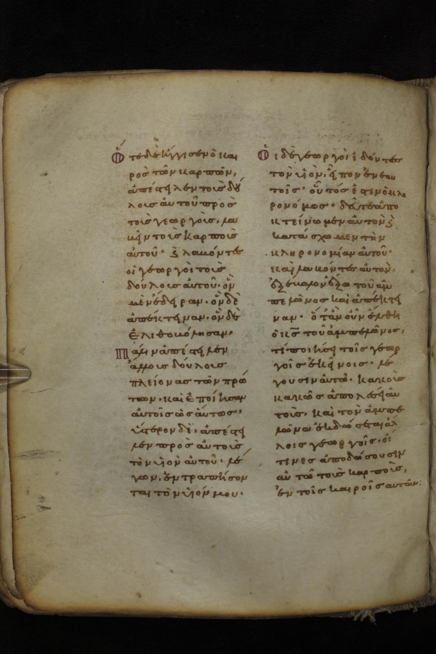 Eleventh century minuscule of the Gospels on parchment; 266 leaves, 2 column, 22 lines per column. Images were taken at the National Library of Greece in Athens.