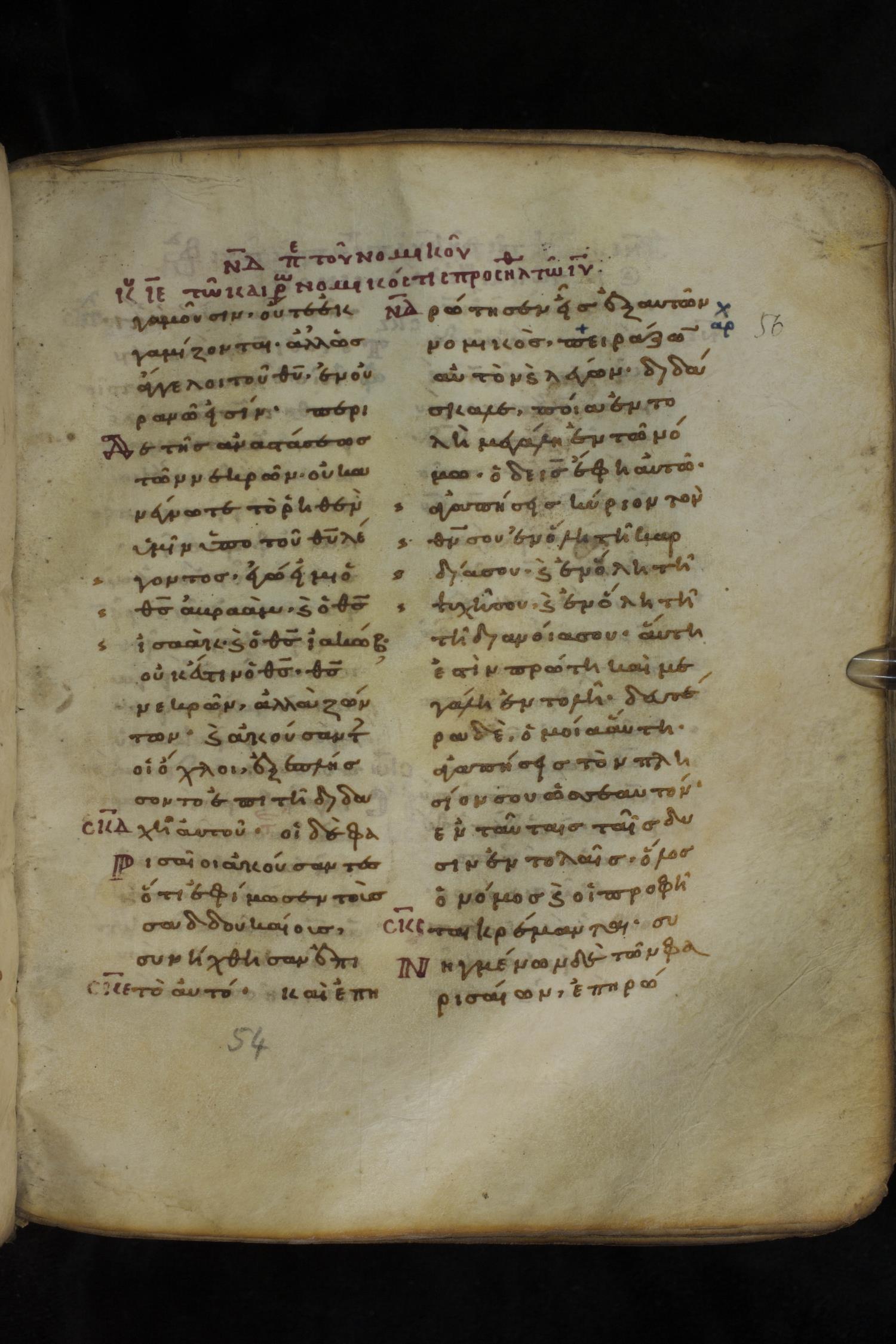 Eleventh century minuscule of the Gospels on parchment; 266 leaves, 2 column, 22 lines per column. Images were taken at the National Library of Greece in Athens.