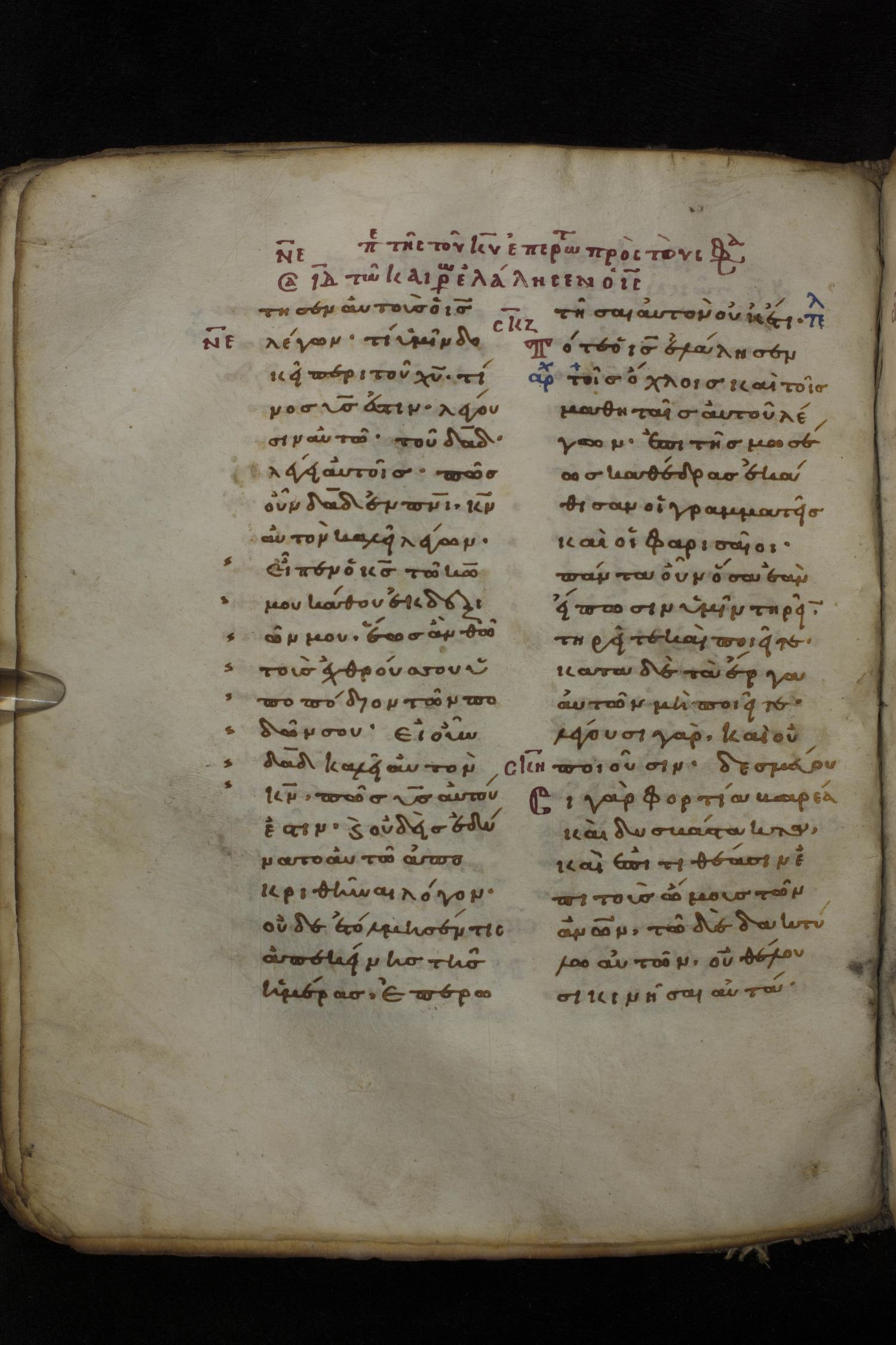 Eleventh century minuscule of the Gospels on parchment; 266 leaves, 2 column, 22 lines per column. Images were taken at the National Library of Greece in Athens.