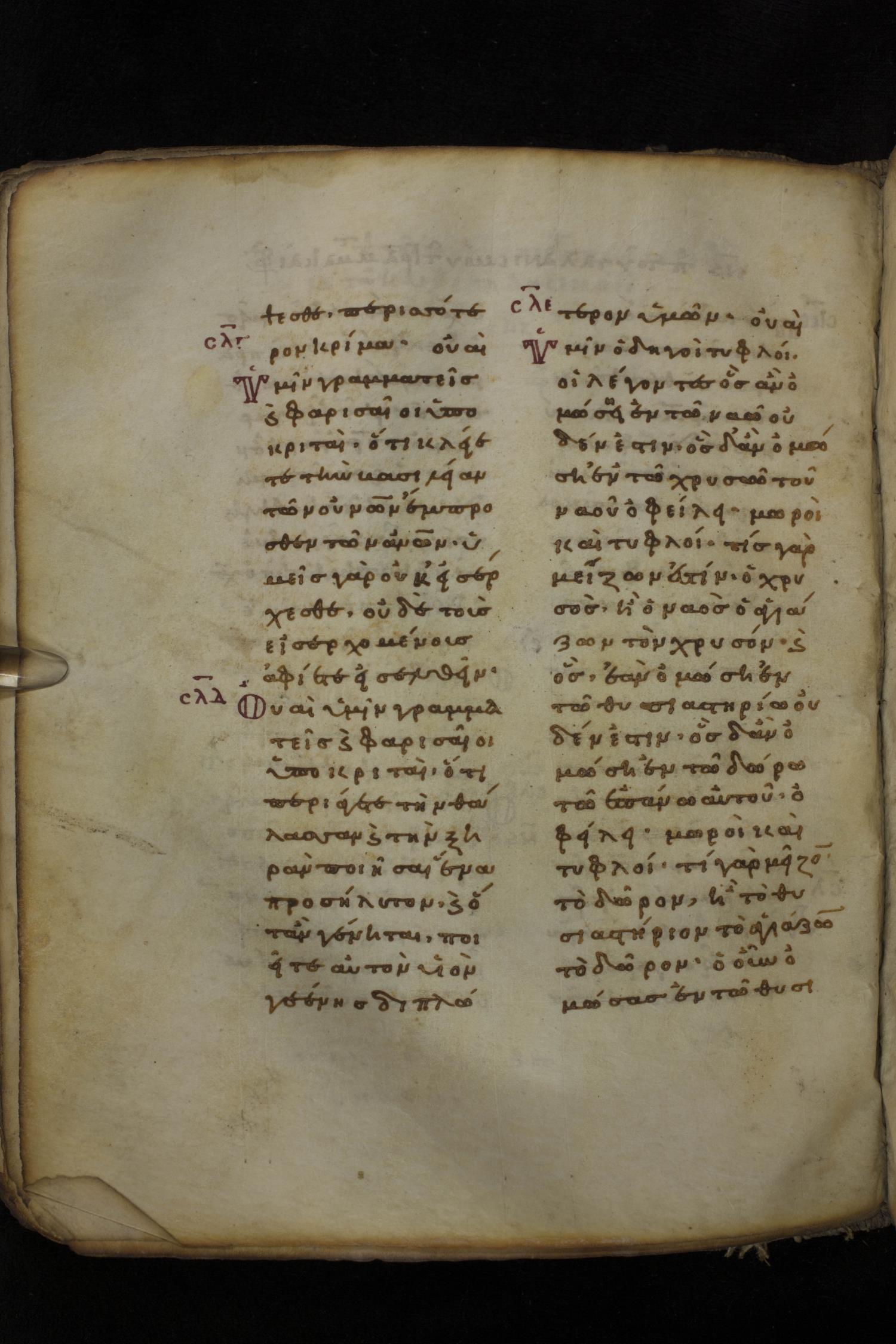 Eleventh century minuscule of the Gospels on parchment; 266 leaves, 2 column, 22 lines per column. Images were taken at the National Library of Greece in Athens.
