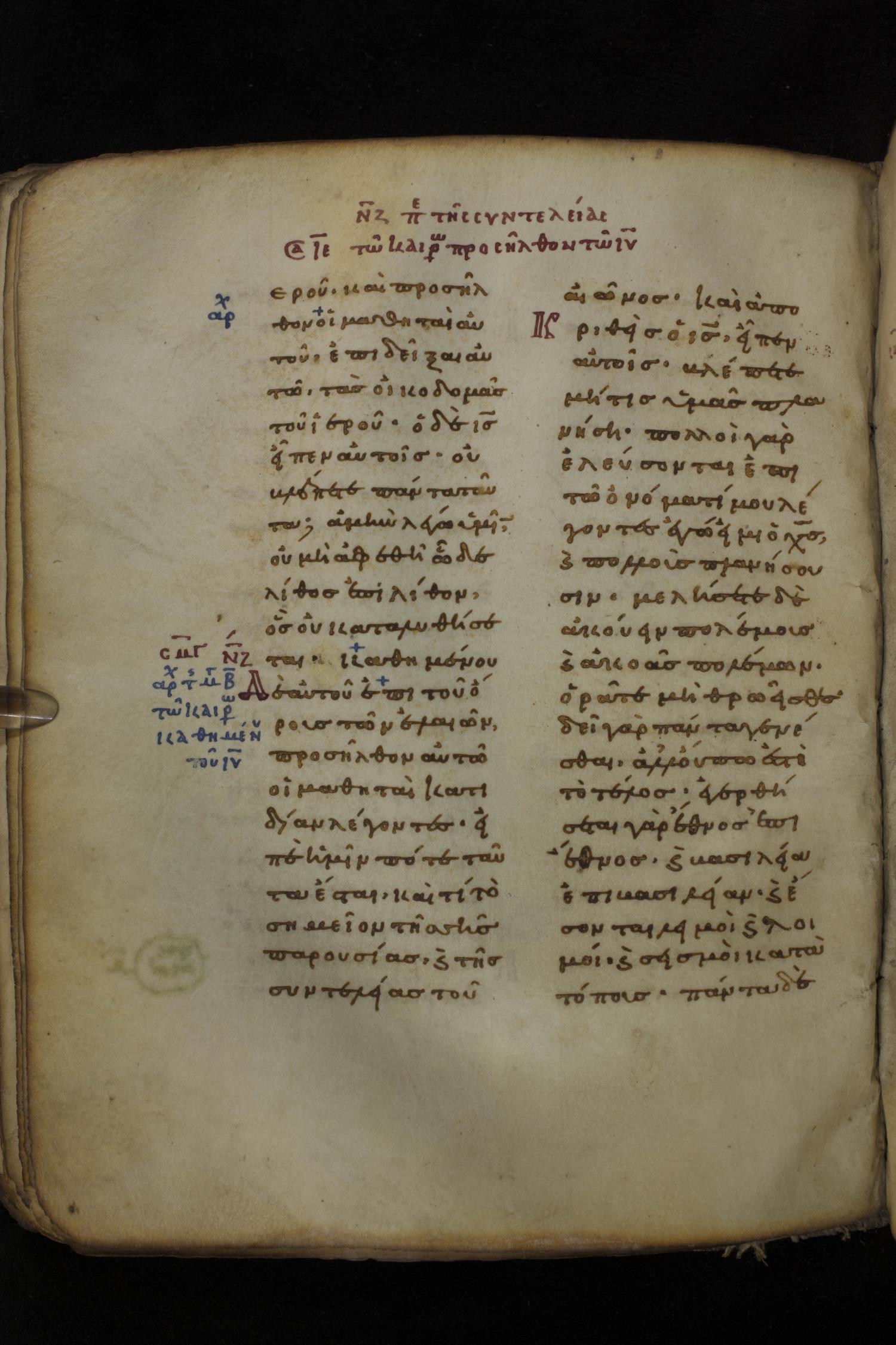 Eleventh century minuscule of the Gospels on parchment; 266 leaves, 2 column, 22 lines per column. Images were taken at the National Library of Greece in Athens.