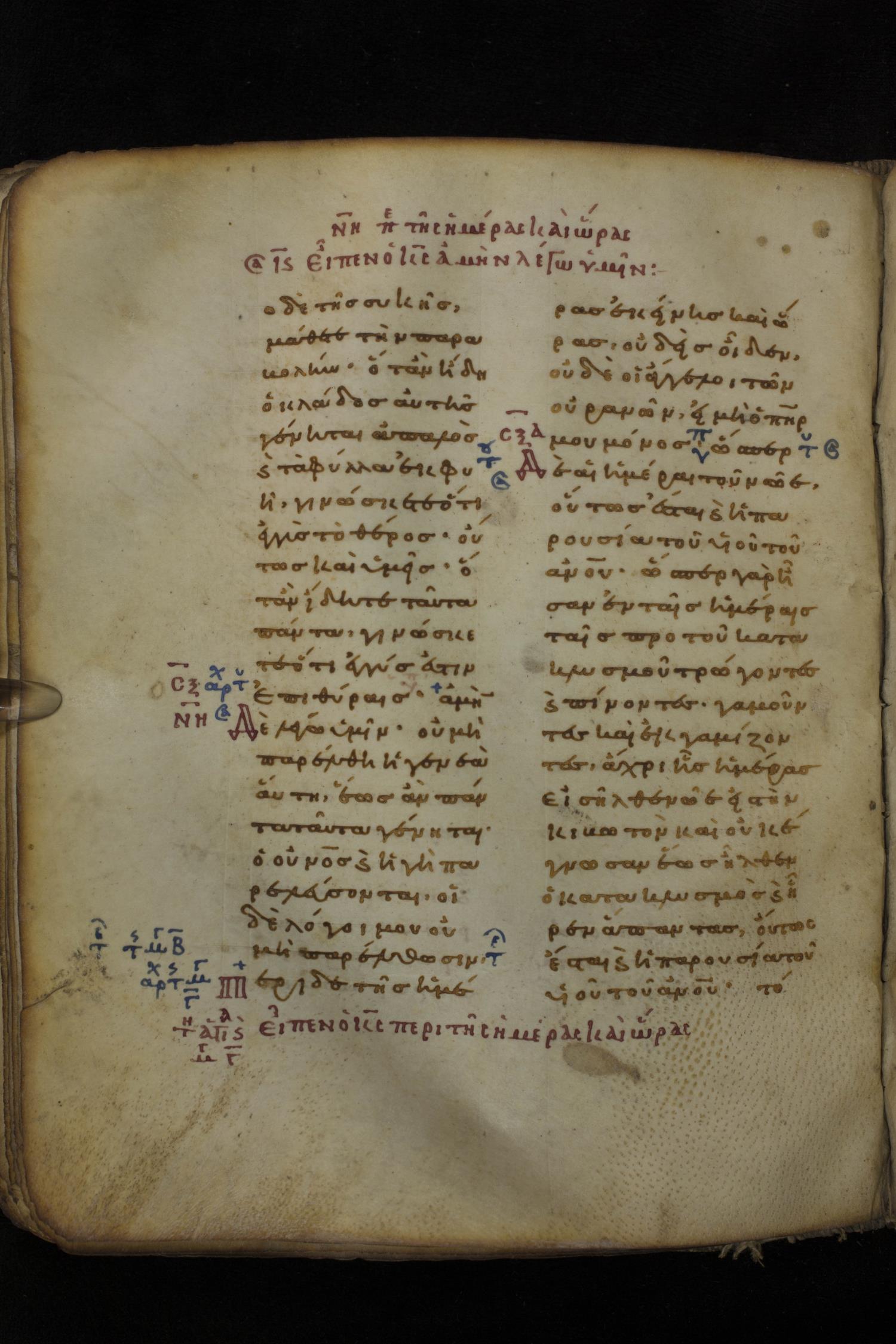 Eleventh century minuscule of the Gospels on parchment; 266 leaves, 2 column, 22 lines per column. Images were taken at the National Library of Greece in Athens.