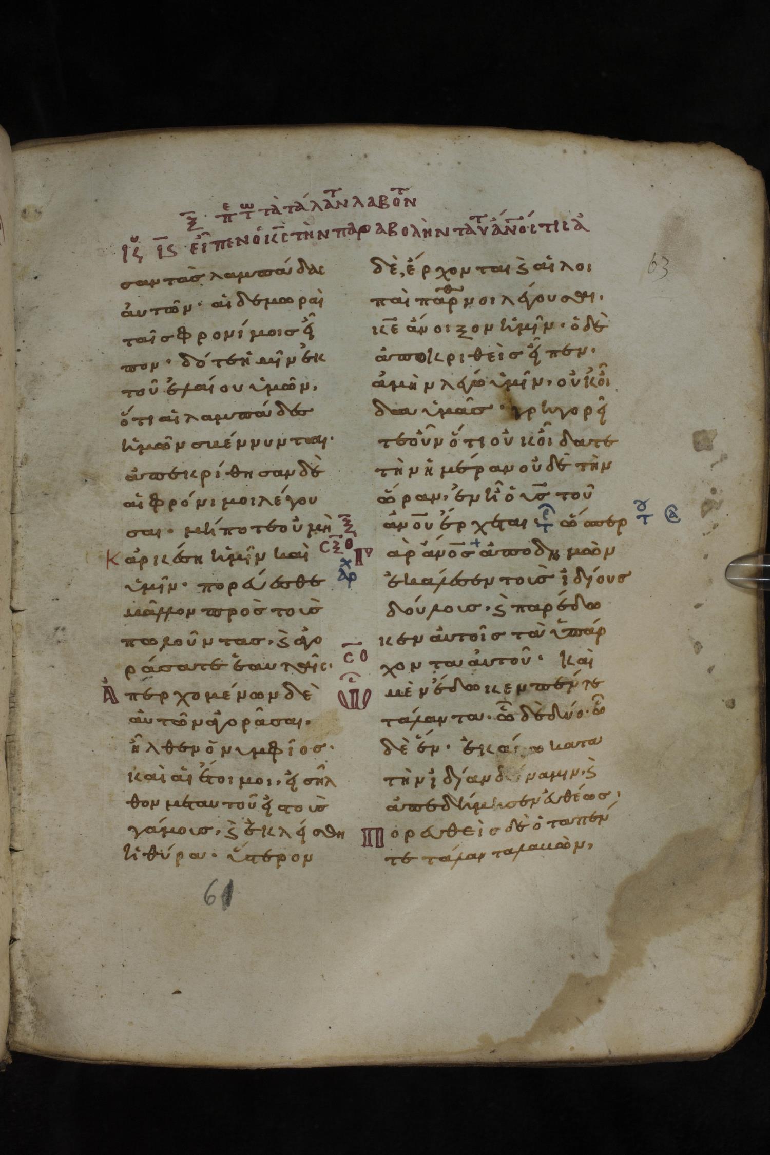 Eleventh century minuscule of the Gospels on parchment; 266 leaves, 2 column, 22 lines per column. Images were taken at the National Library of Greece in Athens.