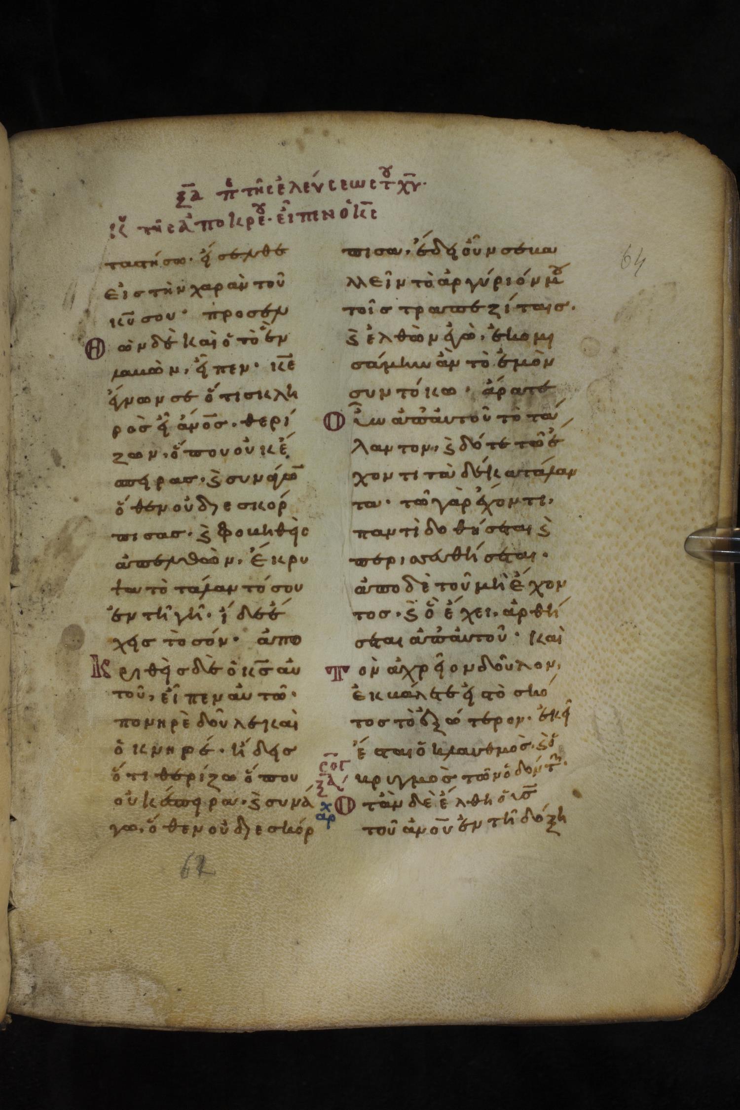 Eleventh century minuscule of the Gospels on parchment; 266 leaves, 2 column, 22 lines per column. Images were taken at the National Library of Greece in Athens.