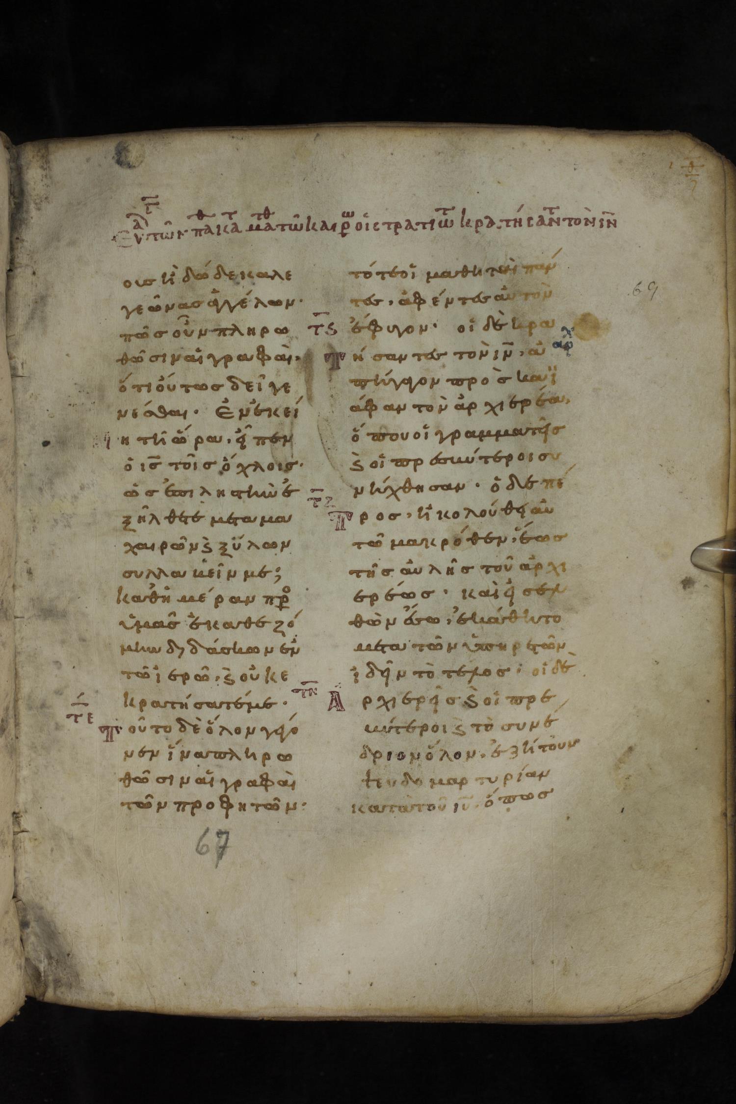 Eleventh century minuscule of the Gospels on parchment; 266 leaves, 2 column, 22 lines per column. Images were taken at the National Library of Greece in Athens.