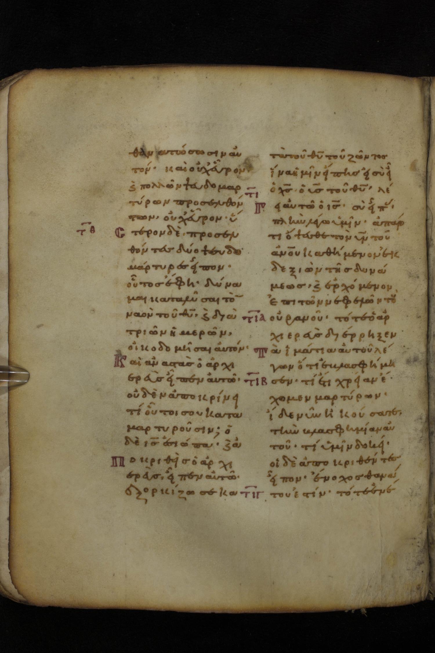 Eleventh century minuscule of the Gospels on parchment; 266 leaves, 2 column, 22 lines per column. Images were taken at the National Library of Greece in Athens.