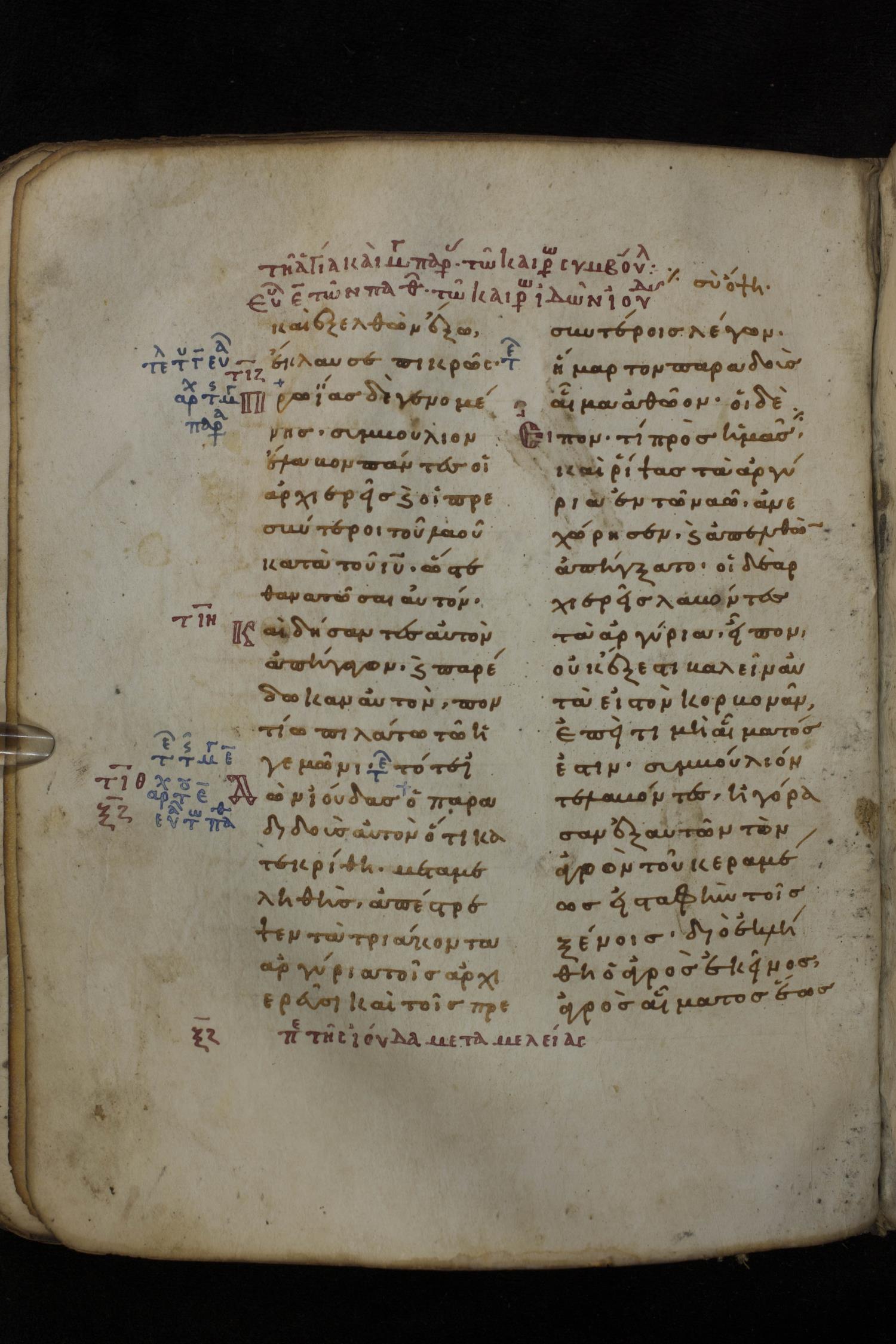 Eleventh century minuscule of the Gospels on parchment; 266 leaves, 2 column, 22 lines per column. Images were taken at the National Library of Greece in Athens.