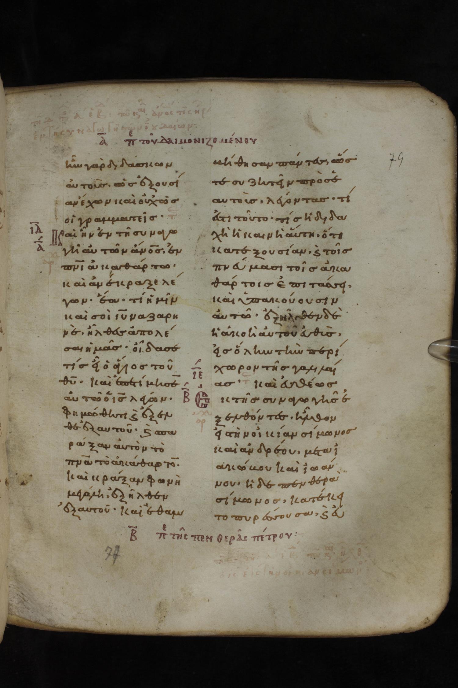 Eleventh century minuscule of the Gospels on parchment; 266 leaves, 2 column, 22 lines per column. Images were taken at the National Library of Greece in Athens.