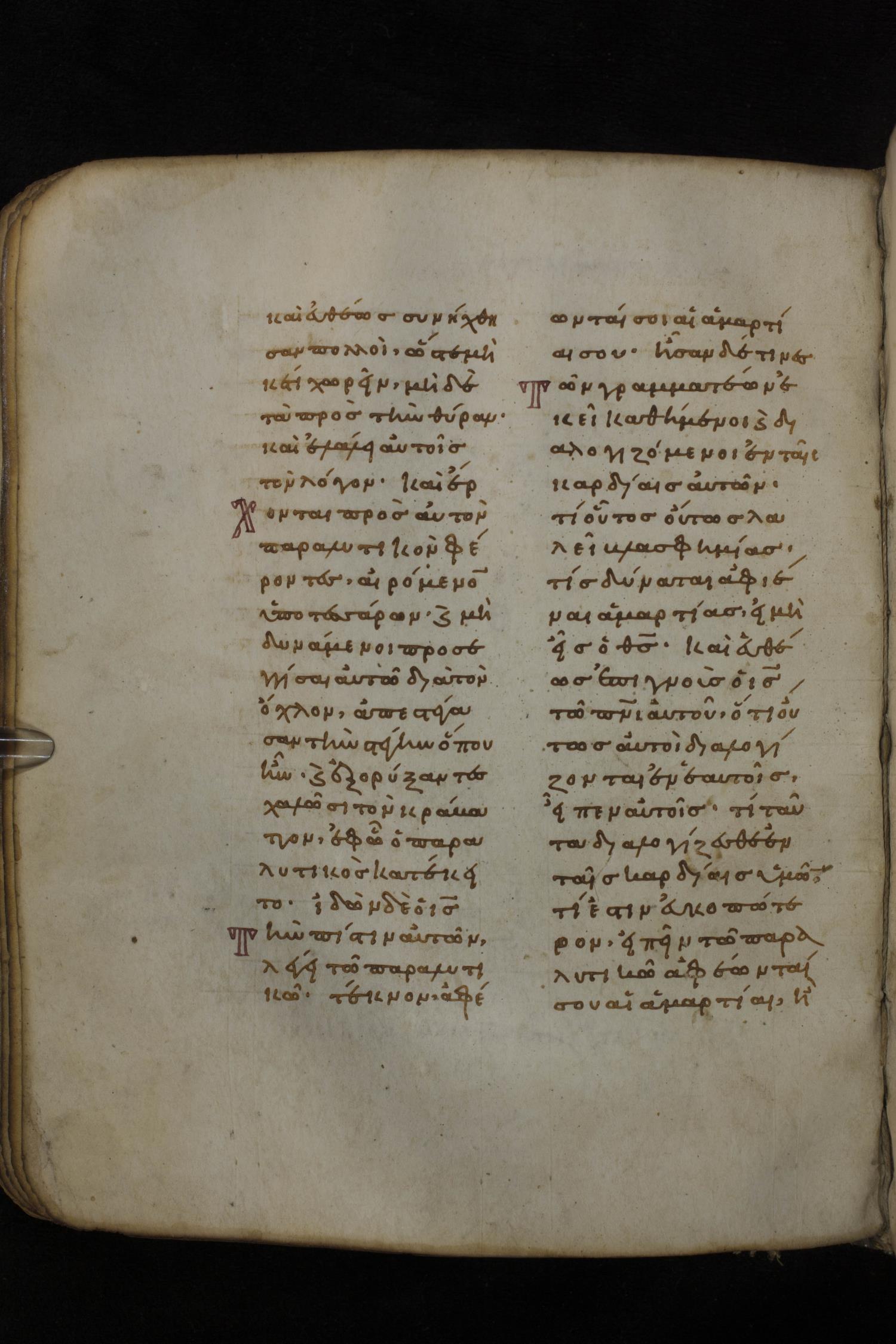 Eleventh century minuscule of the Gospels on parchment; 266 leaves, 2 column, 22 lines per column. Images were taken at the National Library of Greece in Athens.