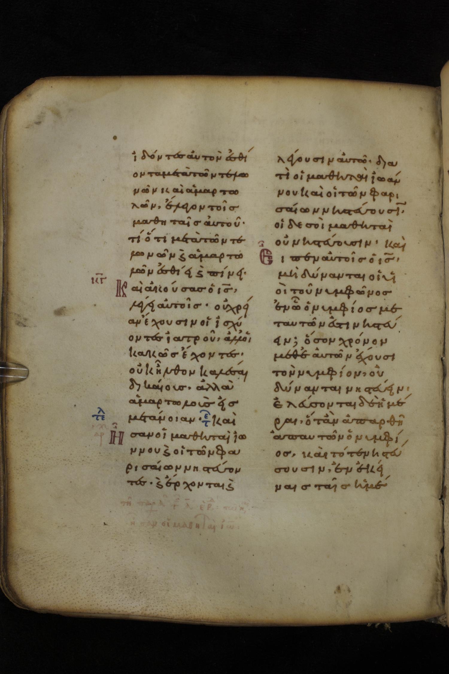 Eleventh century minuscule of the Gospels on parchment; 266 leaves, 2 column, 22 lines per column. Images were taken at the National Library of Greece in Athens.