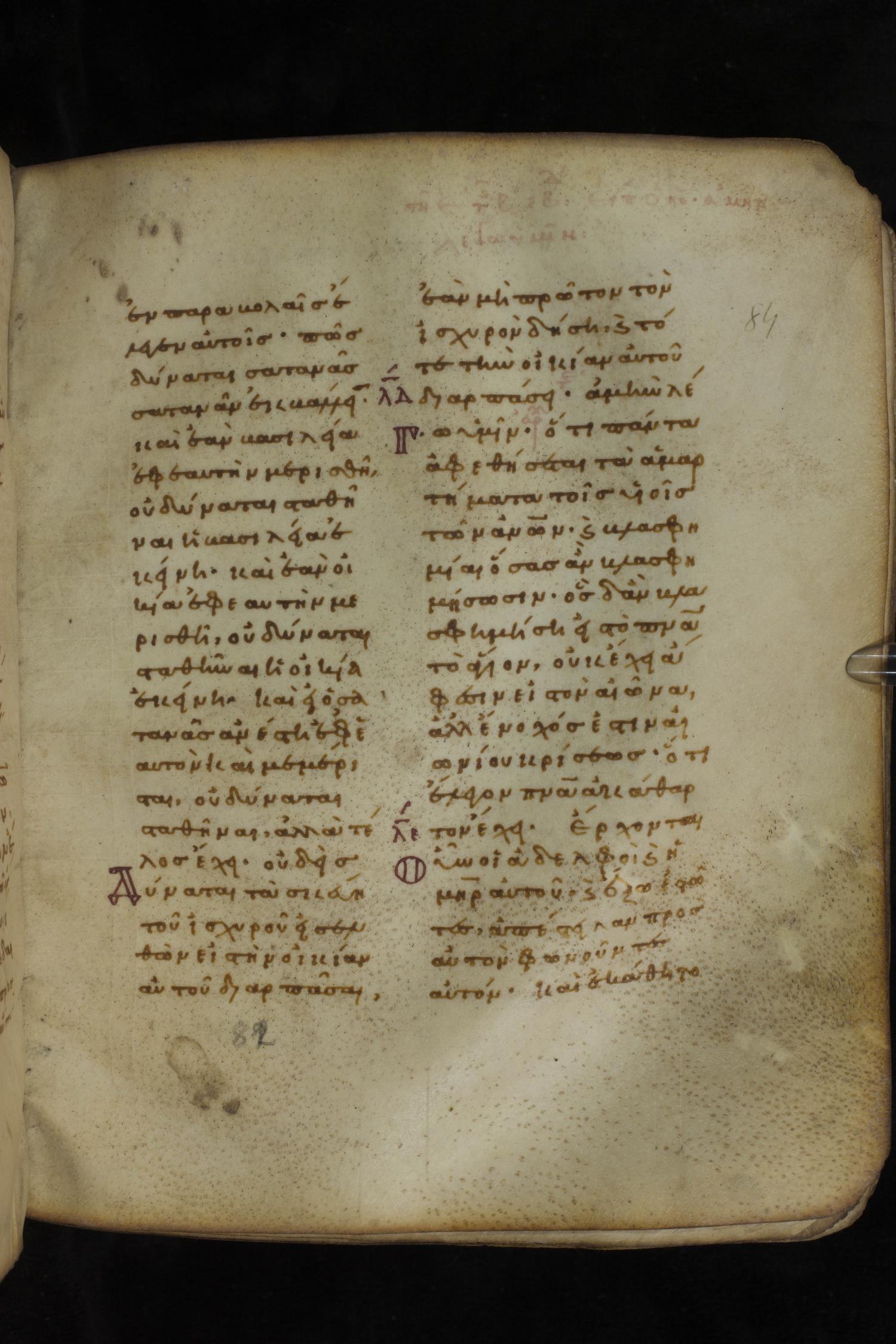 Eleventh century minuscule of the Gospels on parchment; 266 leaves, 2 column, 22 lines per column. Images were taken at the National Library of Greece in Athens.