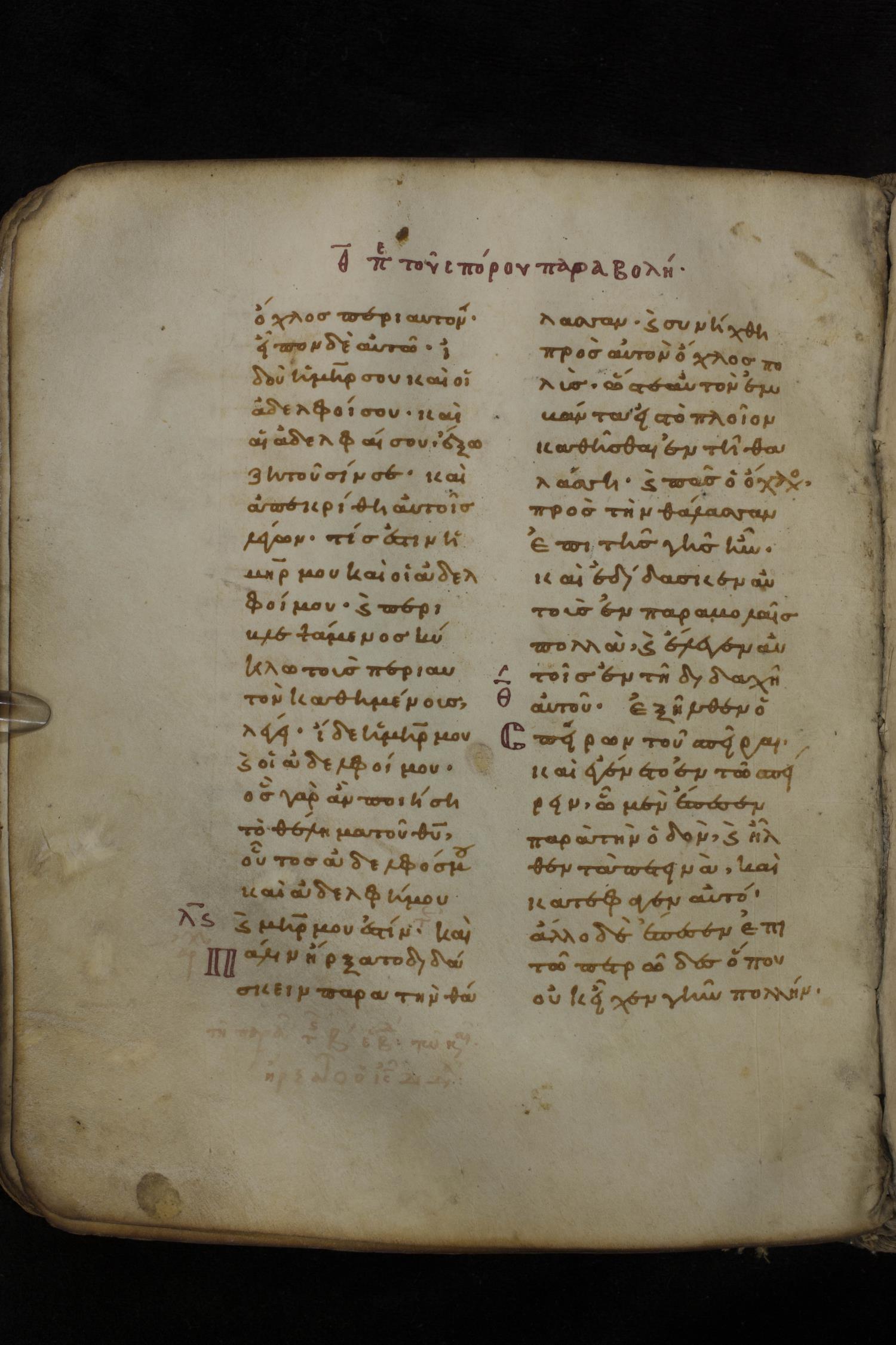 Eleventh century minuscule of the Gospels on parchment; 266 leaves, 2 column, 22 lines per column. Images were taken at the National Library of Greece in Athens.