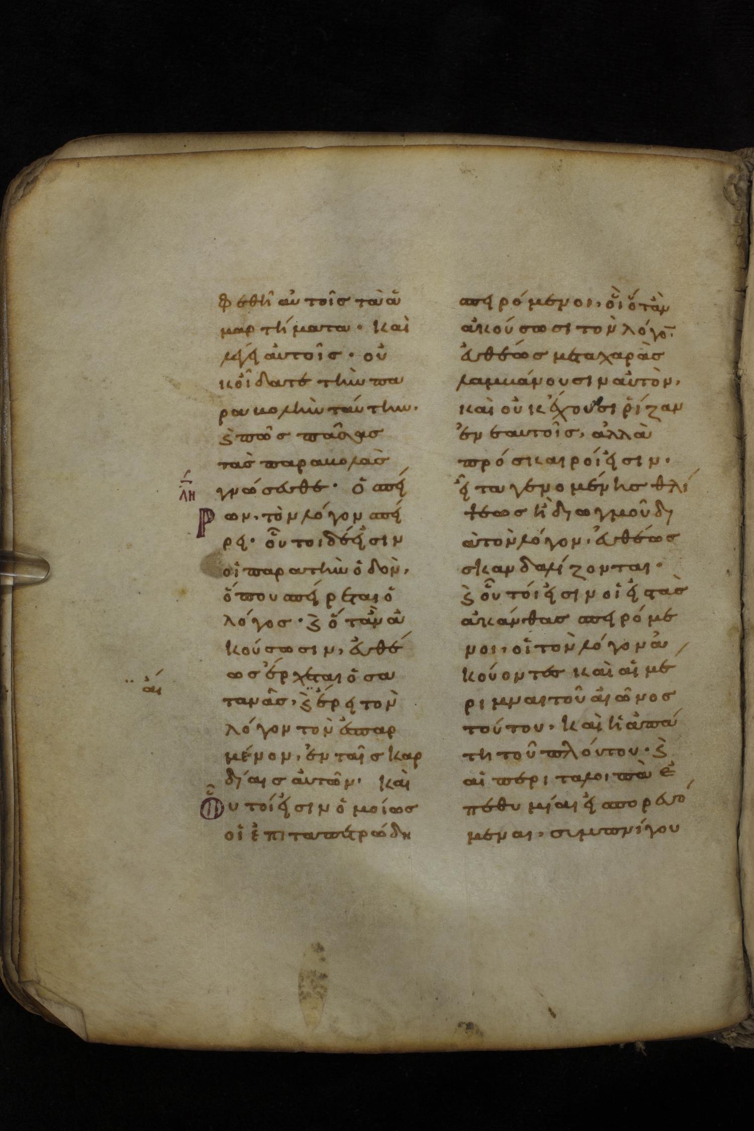 Eleventh century minuscule of the Gospels on parchment; 266 leaves, 2 column, 22 lines per column. Images were taken at the National Library of Greece in Athens.