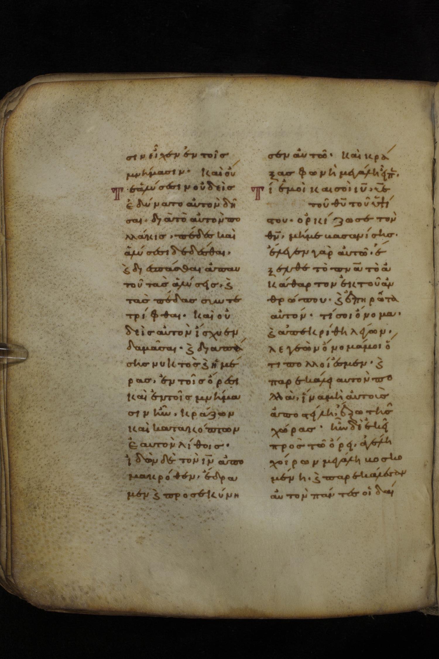 Eleventh century minuscule of the Gospels on parchment; 266 leaves, 2 column, 22 lines per column. Images were taken at the National Library of Greece in Athens.