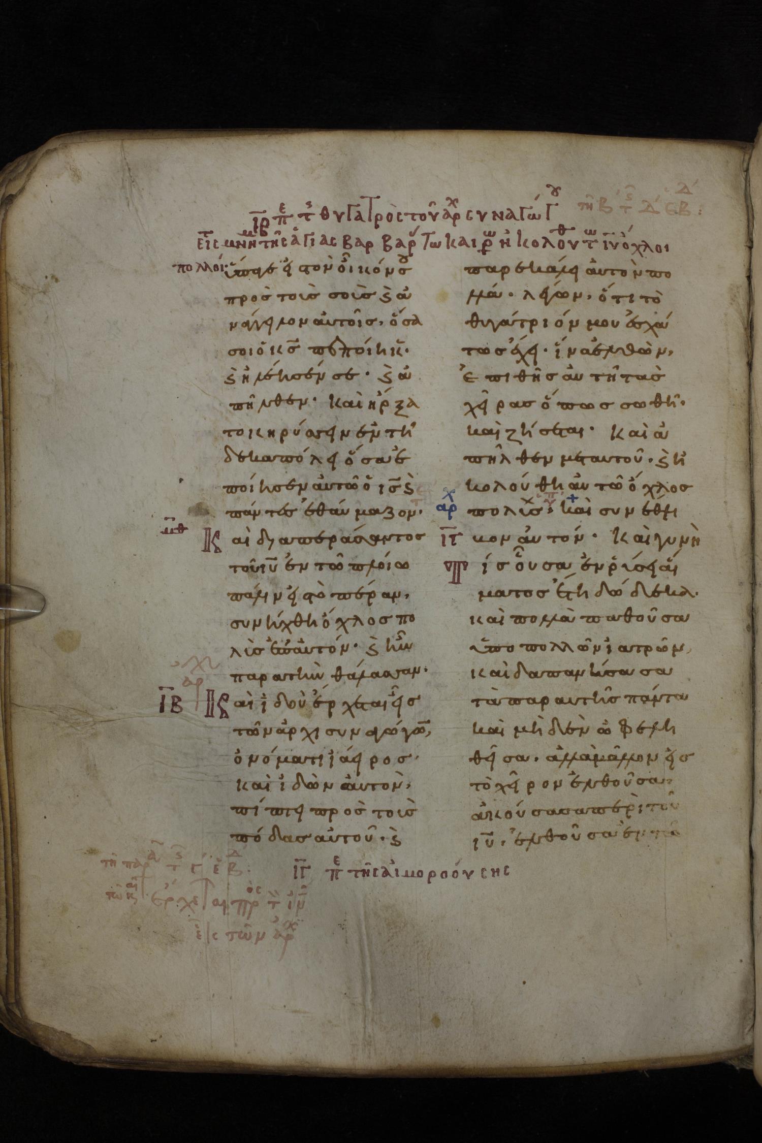 Eleventh century minuscule of the Gospels on parchment; 266 leaves, 2 column, 22 lines per column. Images were taken at the National Library of Greece in Athens.