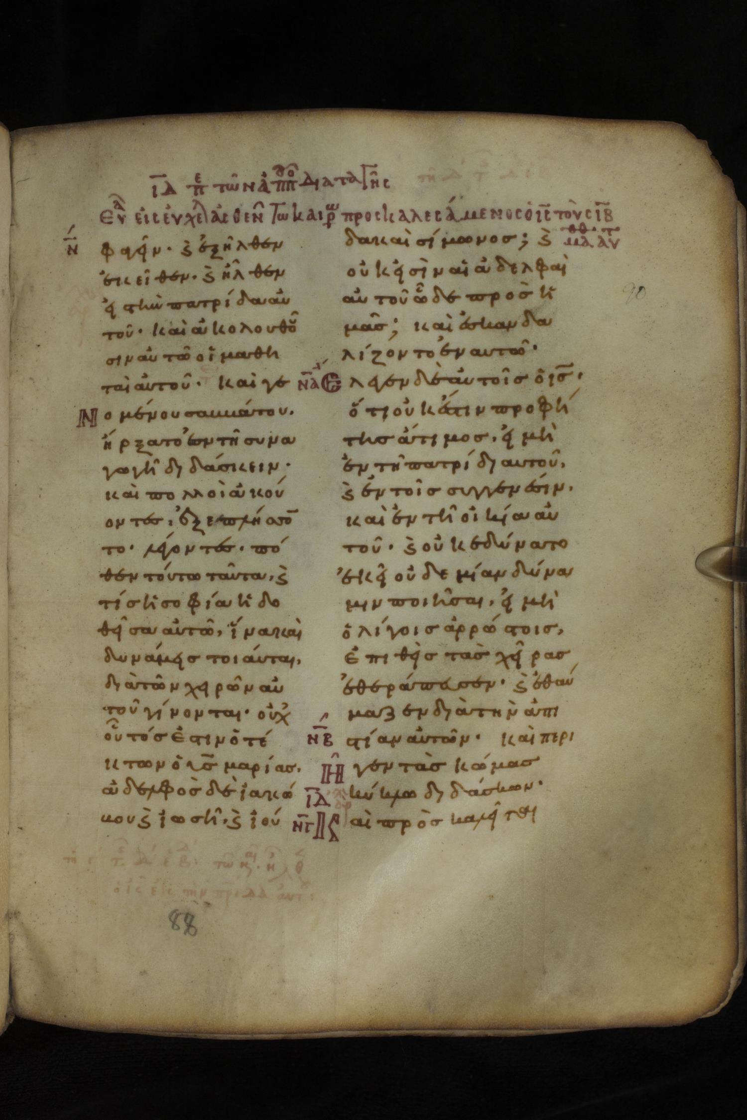 Eleventh century minuscule of the Gospels on parchment; 266 leaves, 2 column, 22 lines per column. Images were taken at the National Library of Greece in Athens.