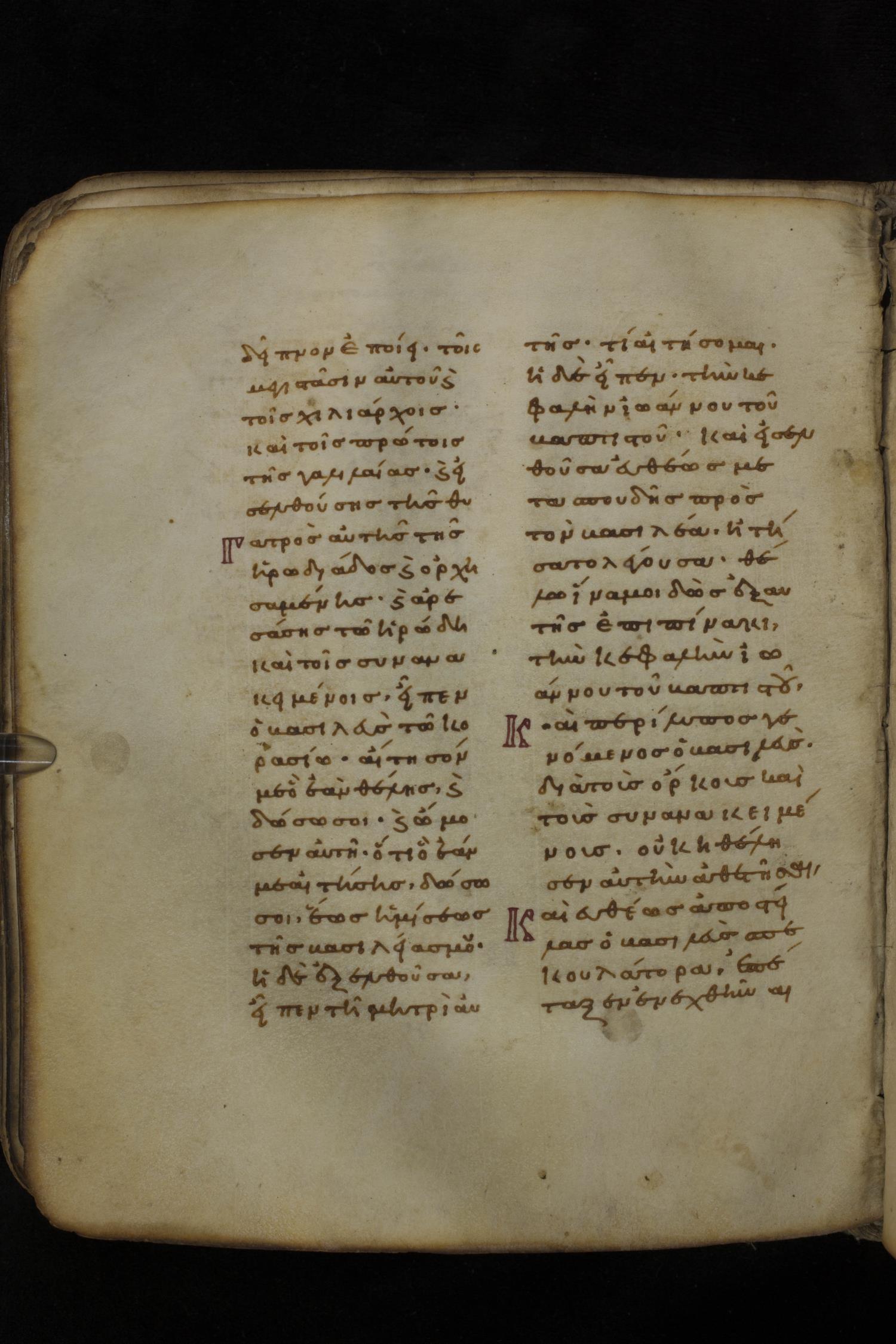 Eleventh century minuscule of the Gospels on parchment; 266 leaves, 2 column, 22 lines per column. Images were taken at the National Library of Greece in Athens.